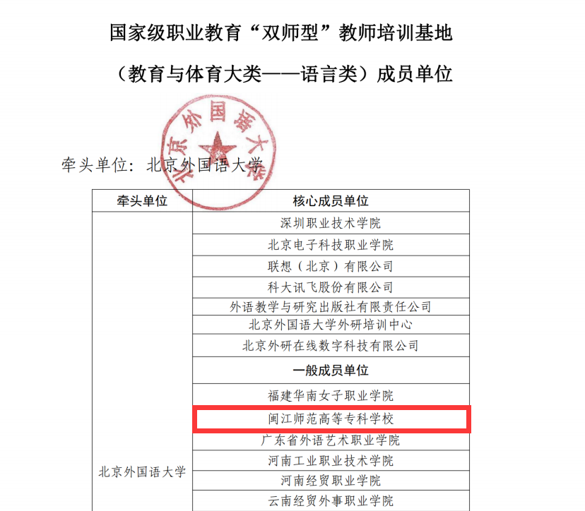 我校高度重视基地申报工作,经过细致的研究和积极的论证,由外语商贸学院进行申报职教国培基地成员单位。此次成功入选职教国培基地成员名单,是教育部、福建省教育厅对我校综合办学实力的充分认可和高度肯定,也是我校“双师型”教师培养培训工作取得的重要成果。