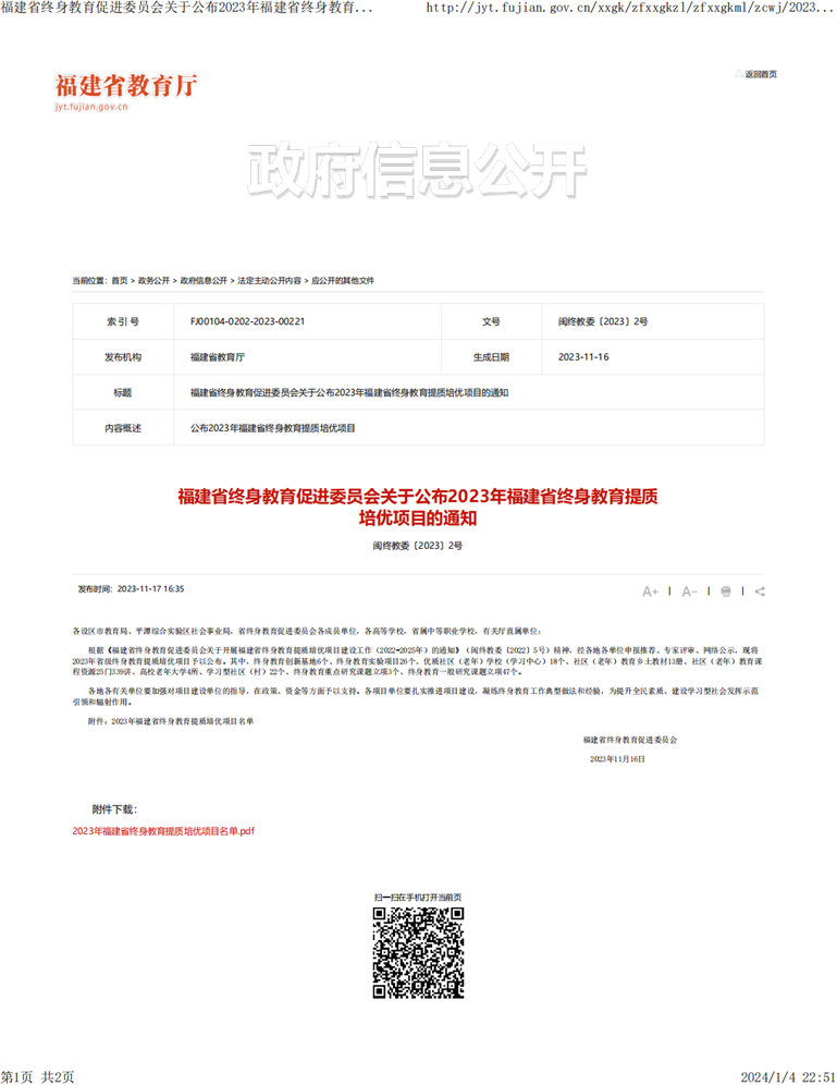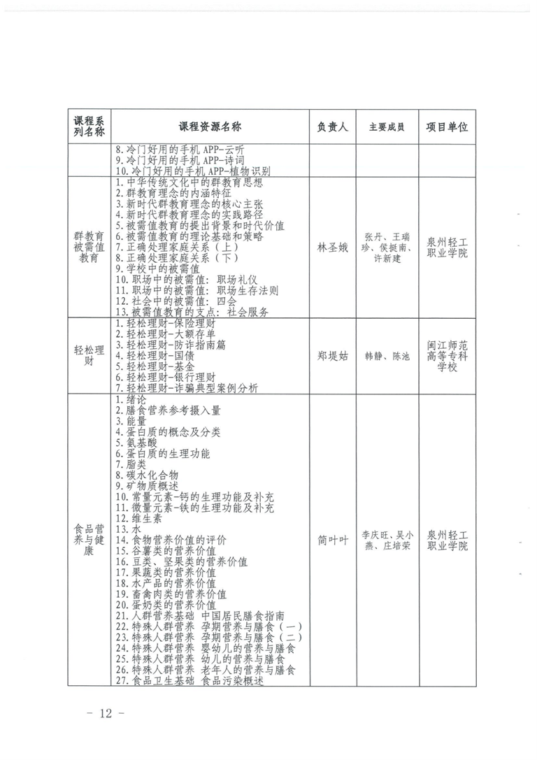 根据《福建省终身教育促进委员会关于开展福建省终身教育提质培优项目建设工作(2022-2025年)的通知》要求,经福建省终身教育服务中心组织专家评议和省教育厅审核,外语商贸学院郑堤姑、韩静和陈池老师报送的《轻松理财》课程成功入选社区(老年)教育课程资源,也是学院第一次获批终身教育提质培优项目。