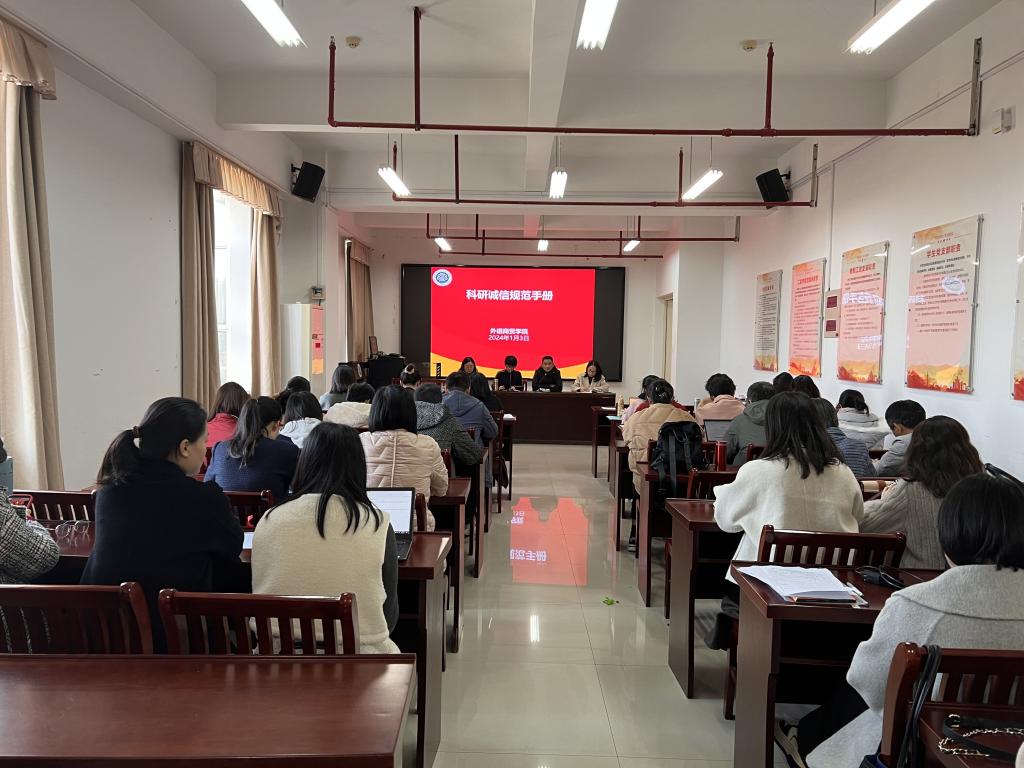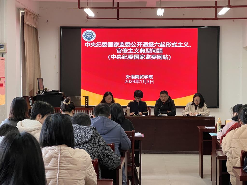 2024年1月3日下午,外语商贸学院在旗山校区党员活动室召开学院例会,党总支书记林冉、院长何少娴、副书记卢燕红、副院长陈海燕、综合科科长刘诗雨及全院教职工参会。会议由何少娴院长主持。