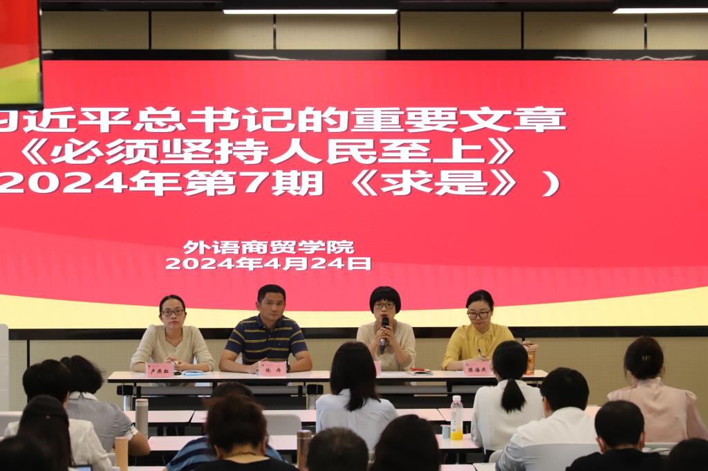 2024年4月24日下午,外语商贸学院在产创楼307多功能报告厅召开学院例会,党总支书记林冉、院长何少娴、副书记卢燕红、副院长陈海燕、综合科科长刘诗雨及全院教职工参会。会议由何少娴院长主持。