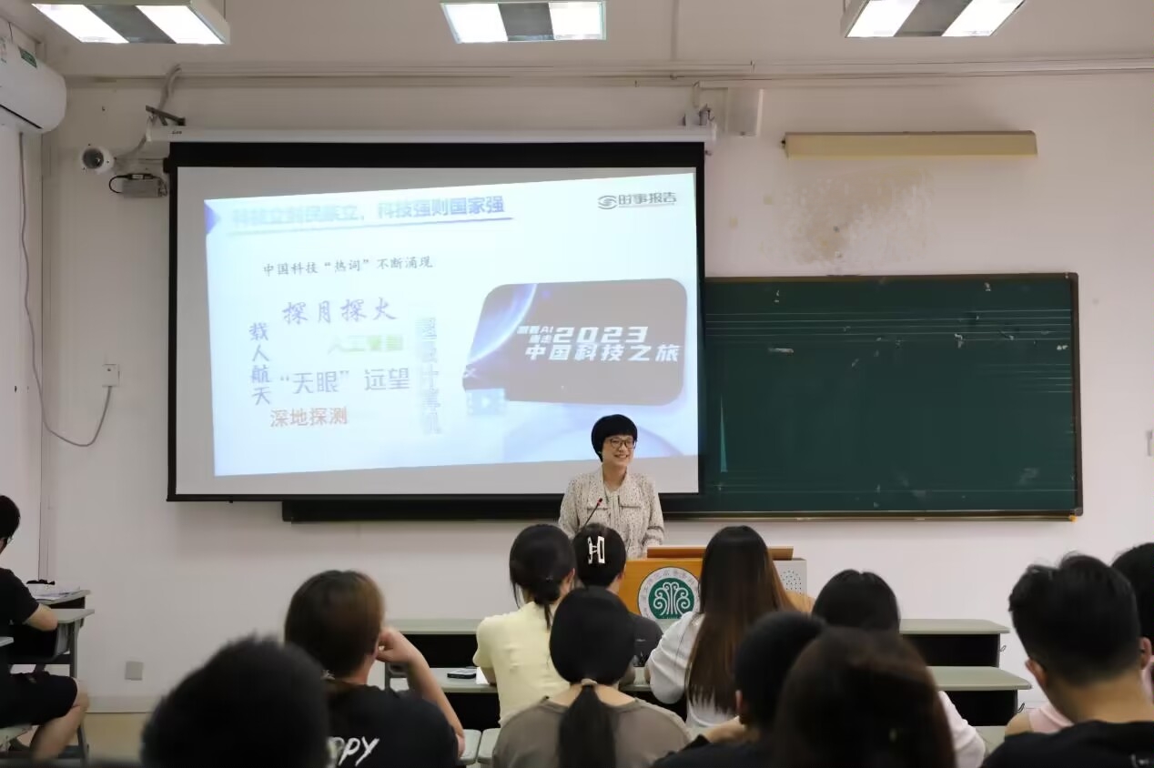 2024年5月29日下午18:30,外语商贸学院院长何少娴在旗山校区3003教室开展形势与政策课,主题为:走好新时代科技自立自强之路,22级跨境电子商务班全体学生参加。