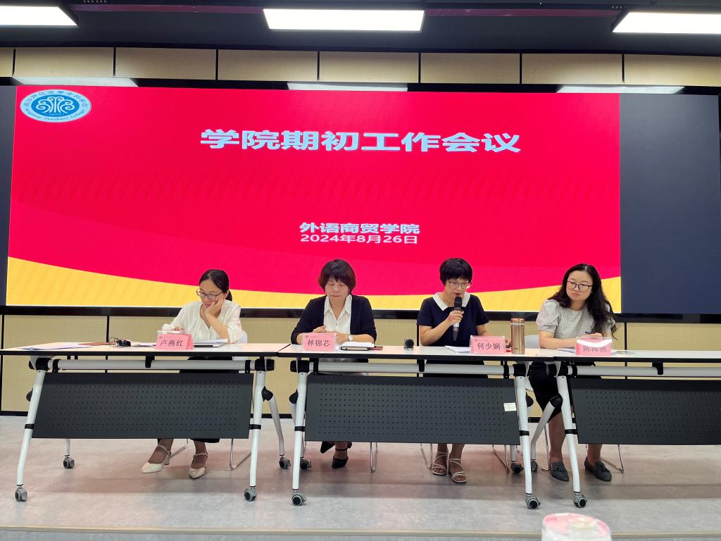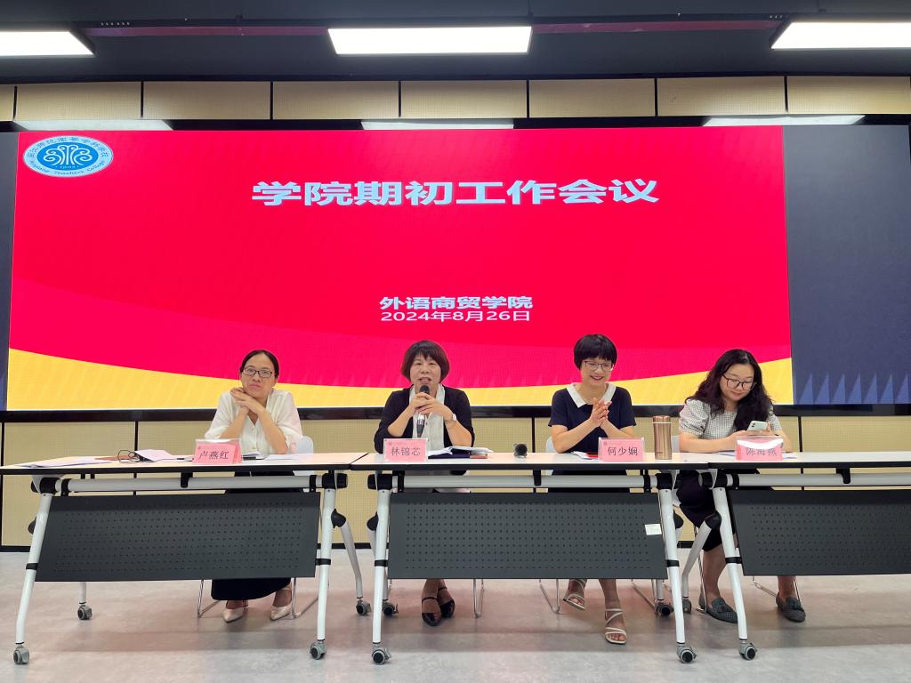 2024年8月26日下午,外语商贸学院于产创楼307多功能报告厅召开新学期教职工大会,学院党总支书记林锦芯、院长何少娴、副书记卢燕红、副院长陈海燕、综合科科长刘诗雨及全院教职工参会。会议由何少娴院长主持。