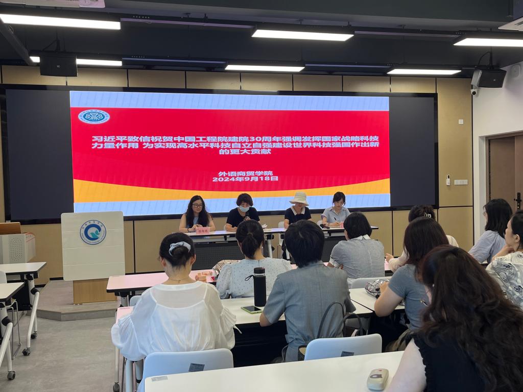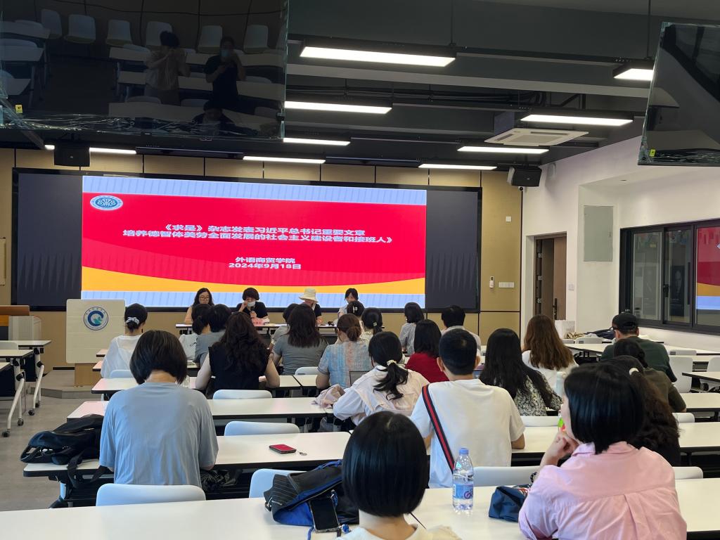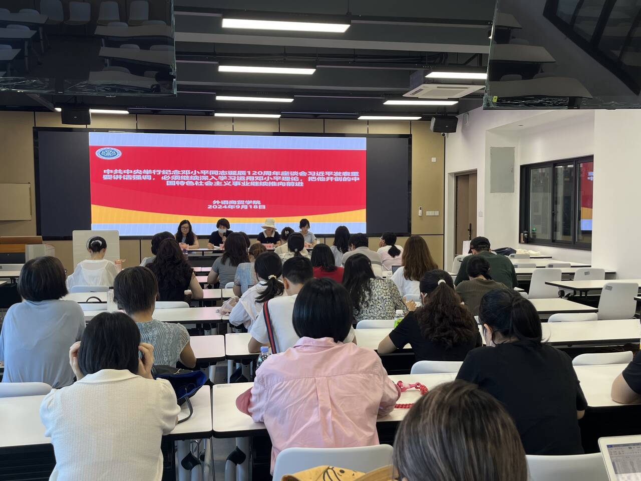 2024年9月18日下午,外语商贸学院在产创楼307多功能报告厅开展9月理论学习,党总支书记林锦芯、院长何少娴、副书记卢燕红、副院长陈海燕、副院长刘诗雨及全院教职工参会。