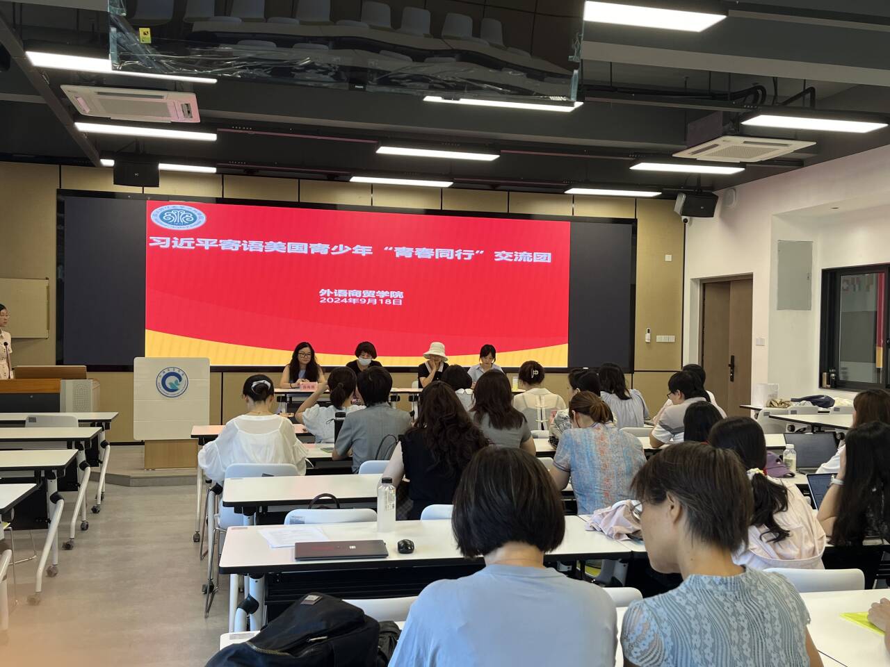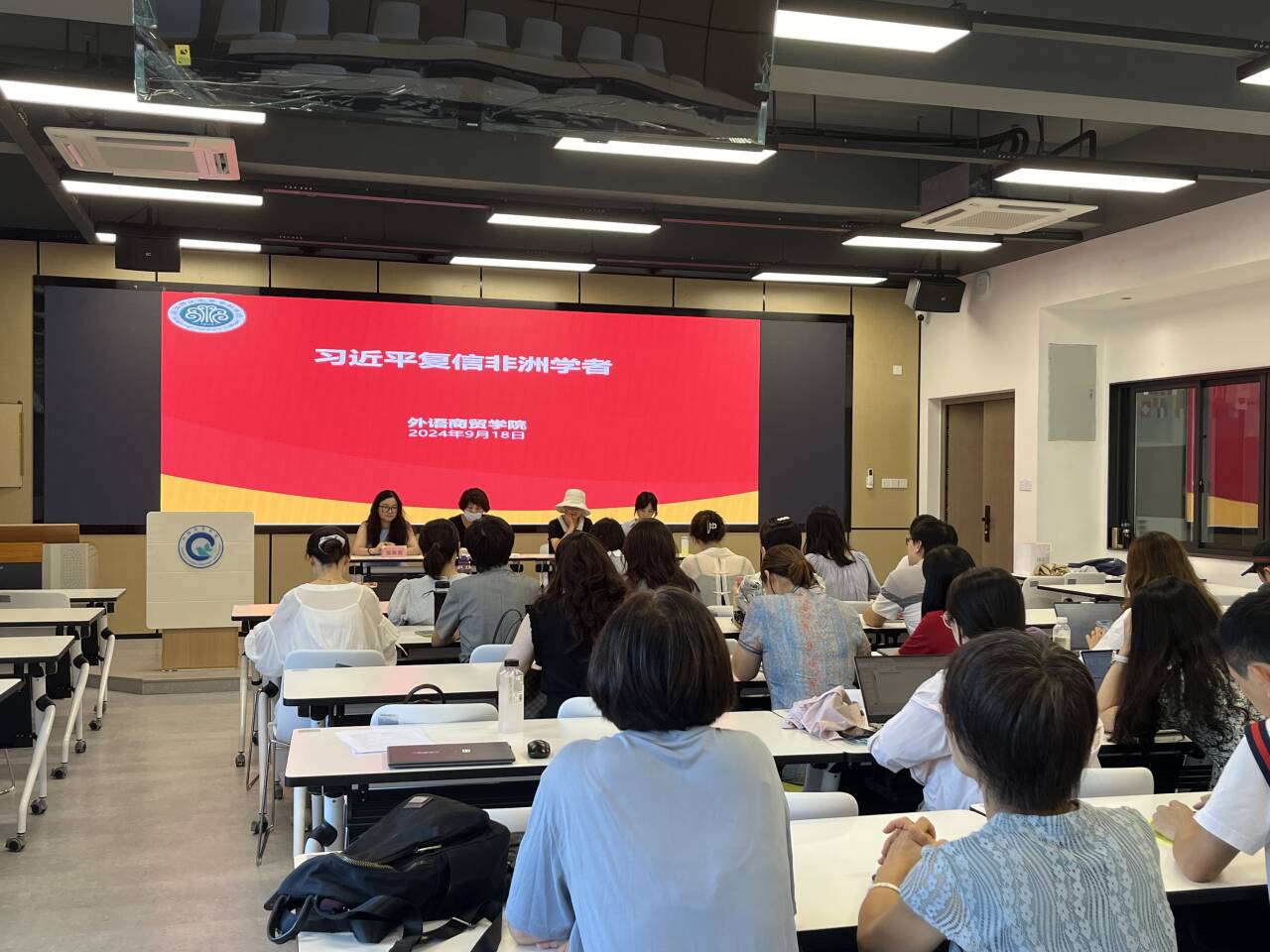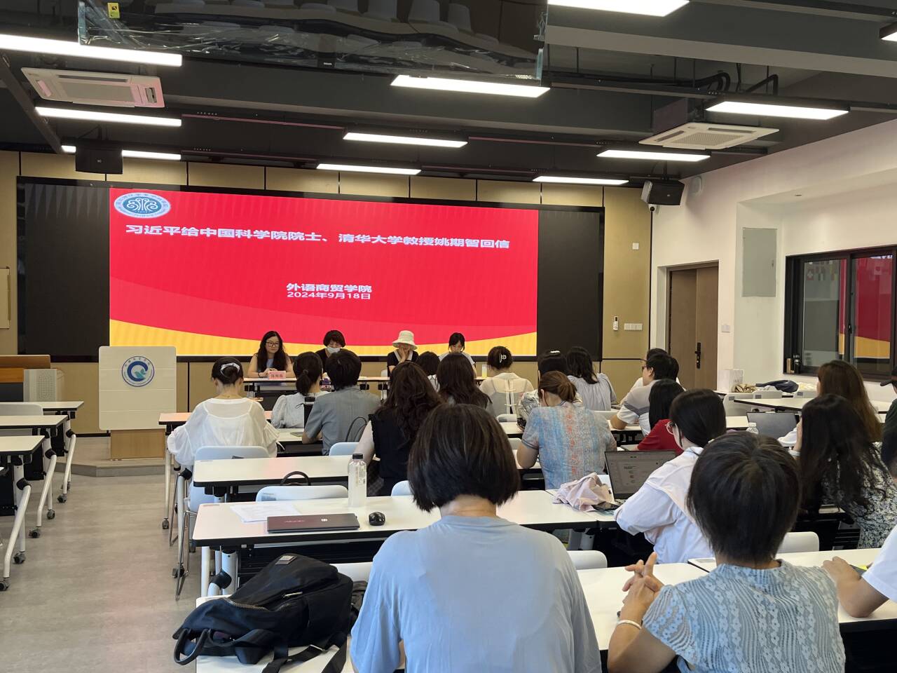 2024年9月18日下午,外语商贸学院在产创楼307多功能报告厅开展9月理论学习,党总支书记林锦芯、院长何少娴、副书记卢燕红、副院长陈海燕、副院长刘诗雨及全院教职工参会。