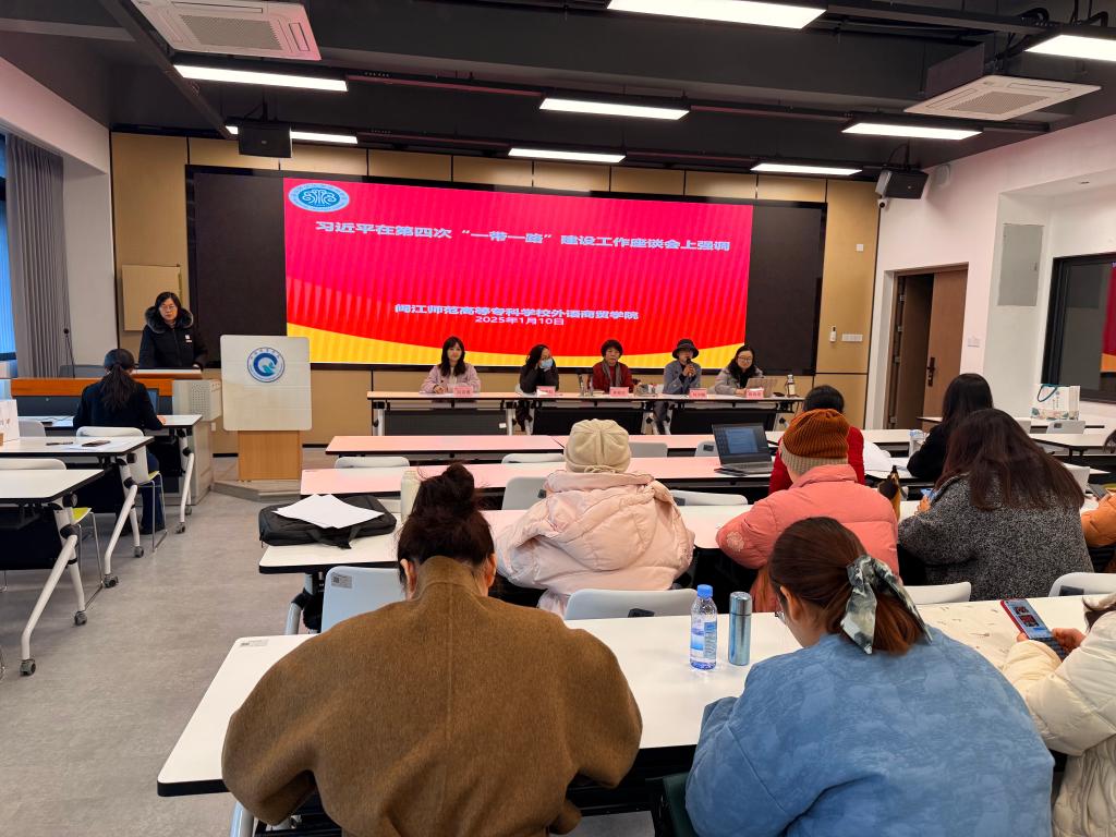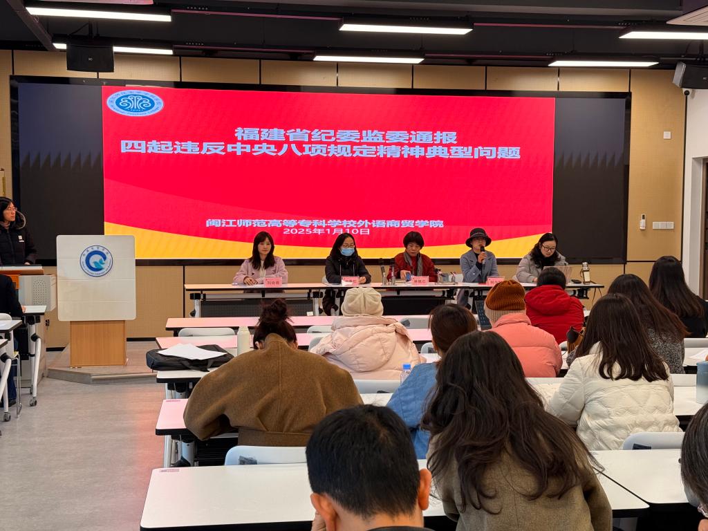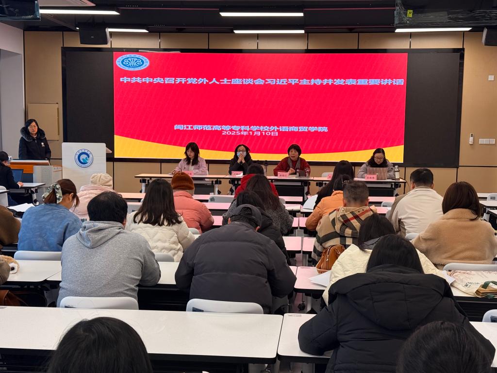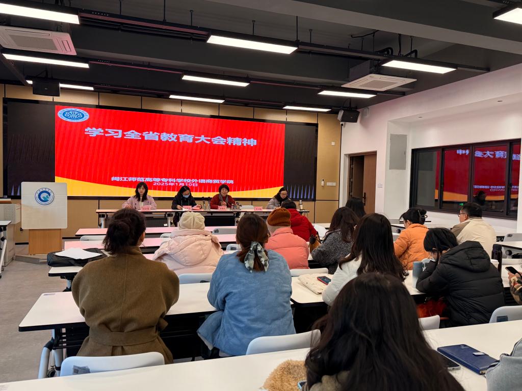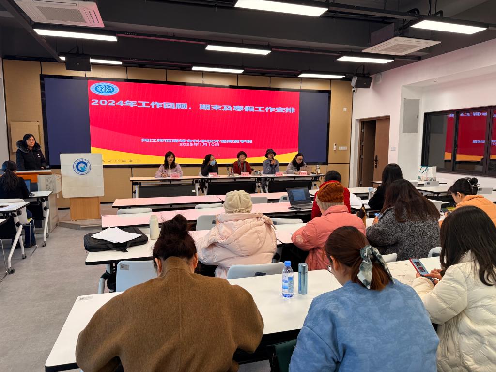 2025 年 1 月 10 日下午,外语商贸学院在产创楼 307 多功能报告厅召开学院全体教职工会议。学院党总支书记林锦芯、院长何少娴、副书记卢燕红、副院长陈海燕、副院长刘诗雨及全体教职工参会。会议由刘诗雨副院长主持。