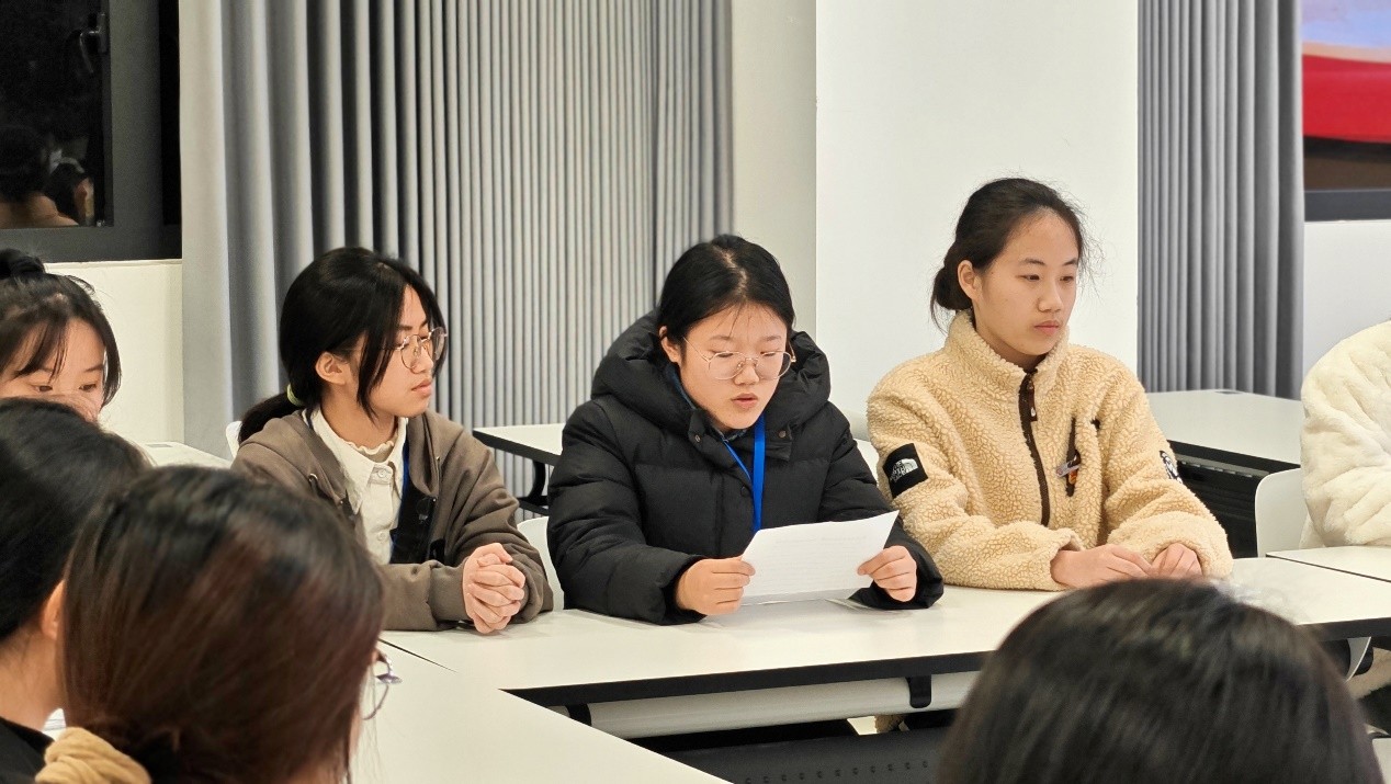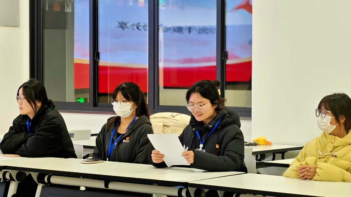 首先,学院团委副书记黄颍领学。她带领大家学习了学校第一次党代会的精神,包括十年来学校发展取得的显著成就,要坚持“五个必须”的宝贵经验,要正确处理“五个重大关系”,要做到“四个更大”,要扭住目标,脚踏实地,奋力谱写高质量发展新篇章。