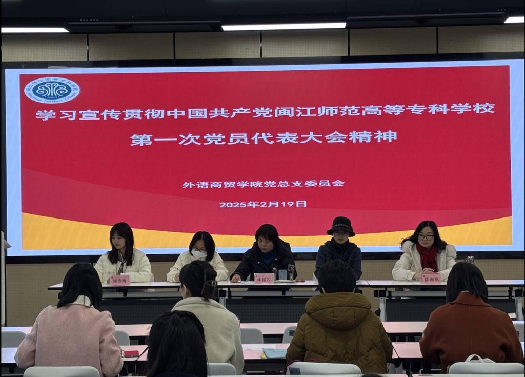 2025年2月19日下午,外语商贸学院党总支学习宣传贯彻中国共产党闽江师范高等专科学校委员会第一次党员代表大会精神,学院全体党员和群众代表参加本次学习,会议由党总支书记林锦芯主持。