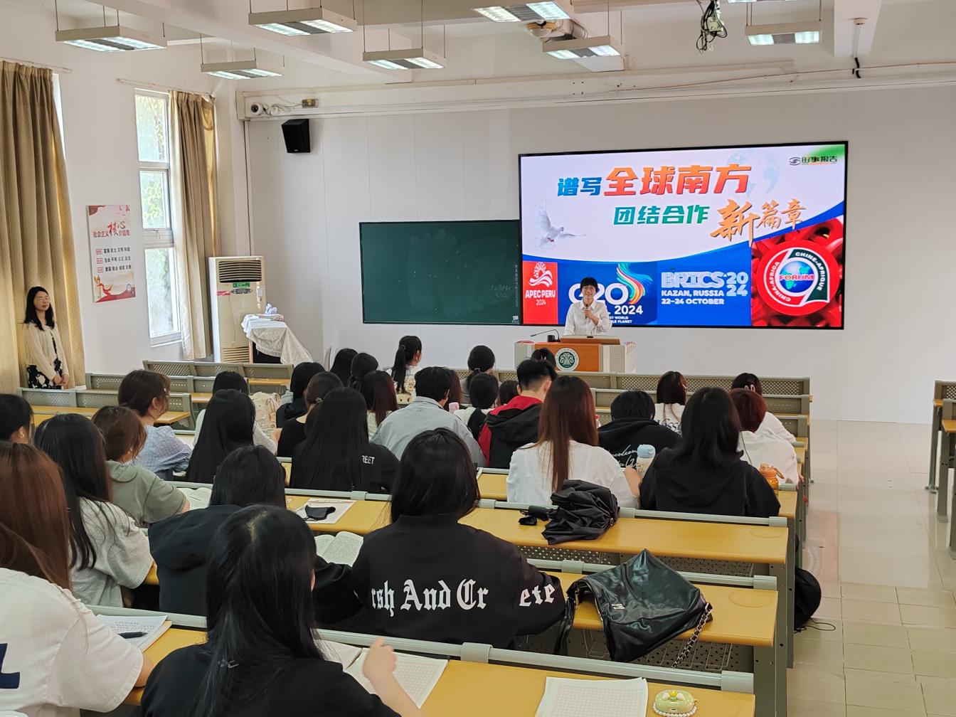 在国际舞台风云变化之际,谱写全球南方团结合作新篇章,不仅关乎世界格局的重塑,更与每一位大学生的未来紧密相连。为让大学生更加深入了解全球南方合作的内涵与意义,外语商贸学院何少娴院长于2025年4月29日在2014教室为23国际经济与贸易1班全体同学开展以“谱写全球南方团结合作新篇章”为主题的形势与政策课。