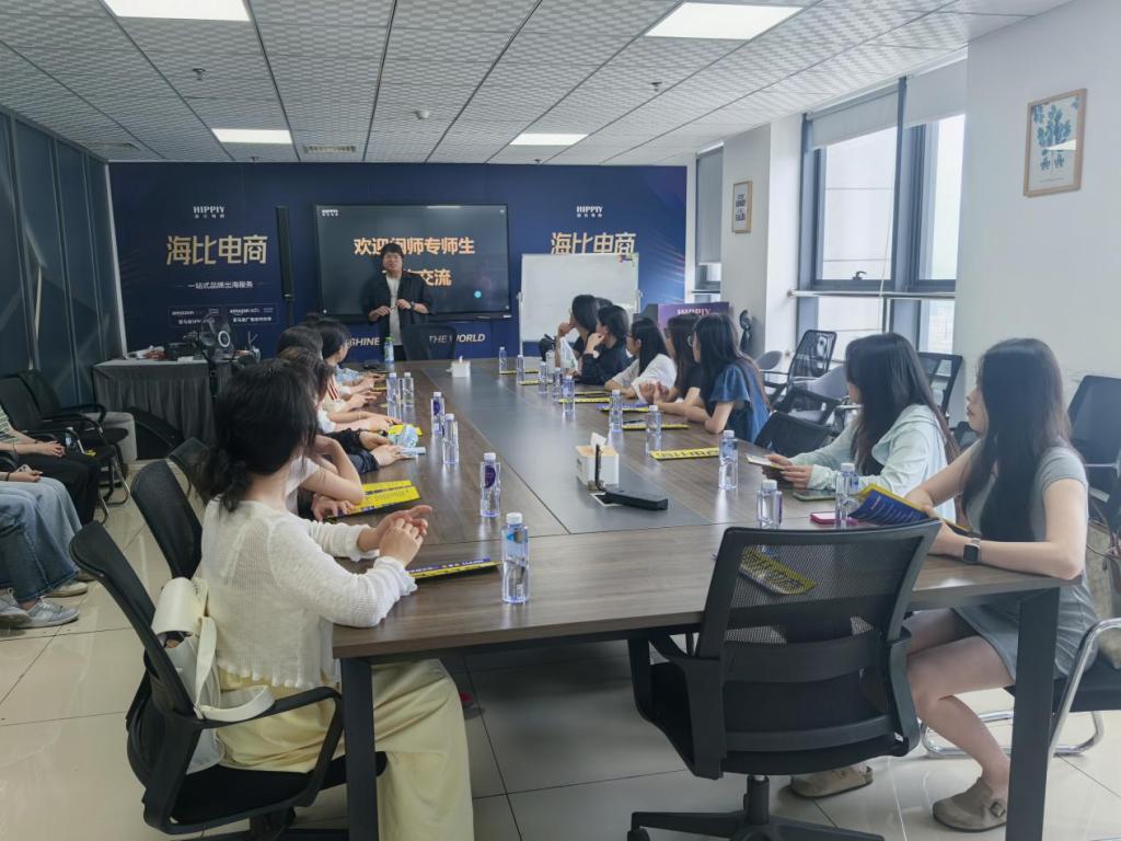 在见习活动中,谢毅强经理通过“发展历程-行业洞察-实践策略”三大模块展开讲解。首先介绍了海比科技从初创企业成长为行业标杆的发展历程,重点分享企业在东南亚市场的开拓经验及北美市场的战略布局。针对当前跨境电商领域的热点问题,谢经理特别分析了中美贸易摩擦背景下的行业应对策略,提出包括“近岸仓储布局”“多平台流量阵”“供应链三级优化”在内的创新解决方案,并以企业实际运营案例详解TikTok直播在东南亚市场的成功实践。