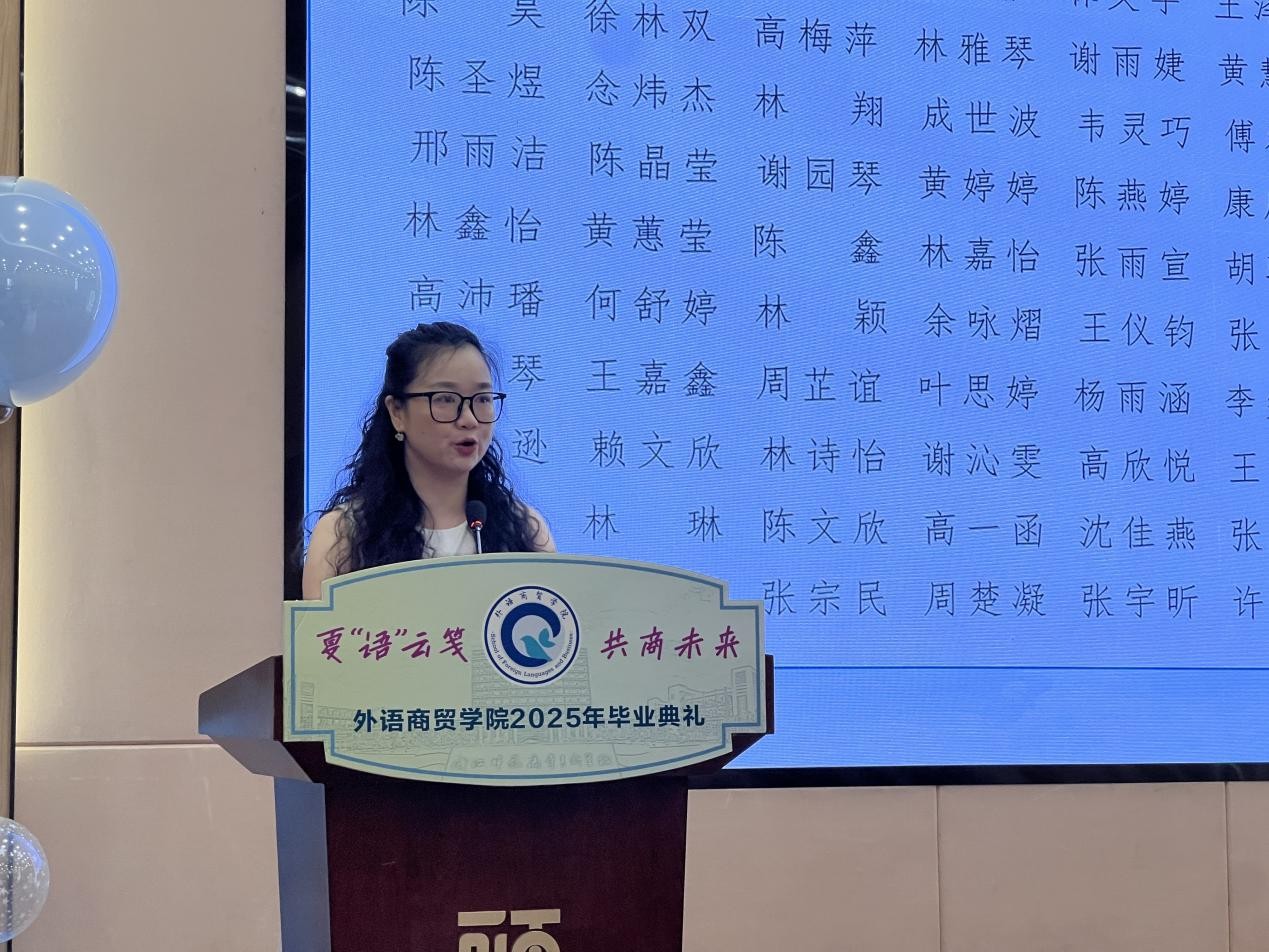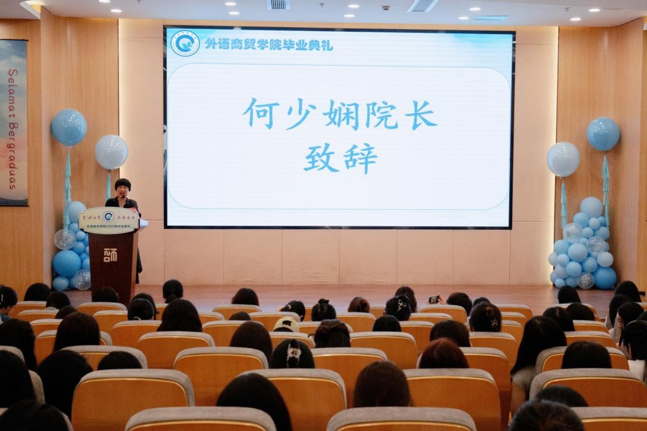院长何少娴上台致辞。她肯定了毕业生们三年大学生活的成长、进步及所获得的好成绩,希望毕业生们作为外语商贸学院的学子,能够积极培养全球化视野,以青春之名,担时代之责,将个人理想融入国家发展大局。无论是投身国际商务舞台,还是扎根基层服务社会,都要永葆报国之心,用所学所长在时代浪潮中书写属于自己的精彩篇章。