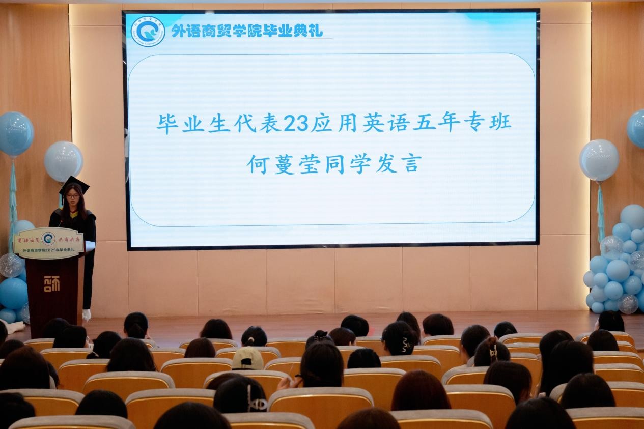 23应用英语五年专班何蔓莹同学代表全体毕业生发言。她回顾了在校生活的点滴,感恩学校和学院的栽培,教室里专注听讲的模样,图书馆里奋笔疾书的身影,操场上肆意奔跑的欢笑,都是青春最鲜活的注脚。