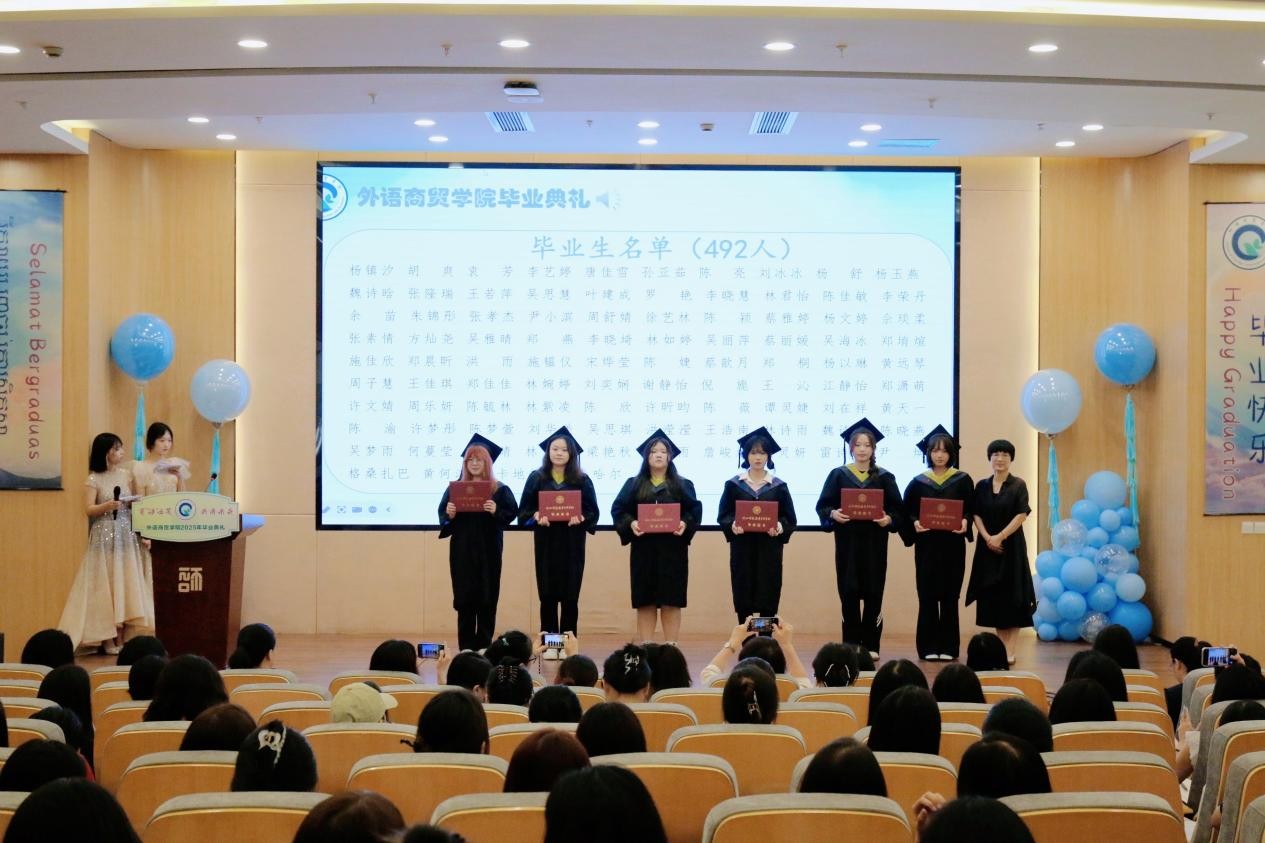 国歌奏响,全体起立。毕业典礼正式开始。首先,卢燕红副书记宣读2025届三好学生、优秀学生干部、优秀共青团员、优秀志愿者、优秀实习生获得者名单,并与刘诗雨副院长共同为获奖学生代表颁发荣誉证书。接着,陈海燕副院长宣布外语商贸学院2025届毕业生毕业决定;何少娴院长为毕业生代表颁发毕业证书。然后,林锦芯书记宣读外语商贸学院2025届优秀毕业生表彰名单,为他们颁发荣誉证书,祝愿他们带着这份荣誉赋予的勇气和信念,在人生新征程上继续书写属于自己的辉煌篇章。