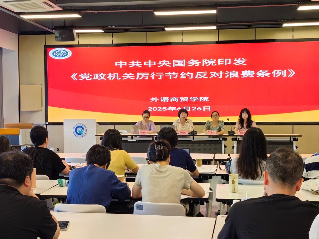 2025年6月26日下午,外语商贸学院于产创楼307多功能报告厅召开全院教职工会议。学院党总支书记林锦芯、副书记卢燕红、副院长陈海燕、副院长刘诗雨及全体教职工参会。会议由刘诗雨副院长主持。