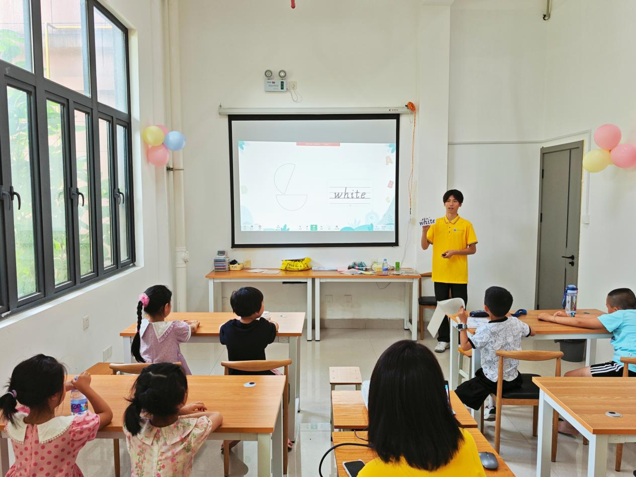 志愿者从字母教学切入,搭配色彩明艳的颜色卡片,让孩子们化身“色彩侦探”猜测对应英语。再借手工创作、涂色游戏,把单调认读变成趣味冒险,引导孩子在动手涂色、大声认读间,稳稳筑牢英语学习的第一块基石。