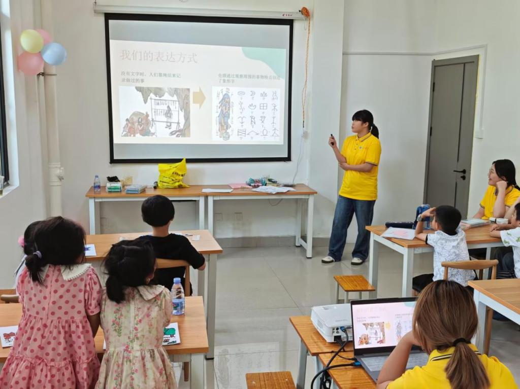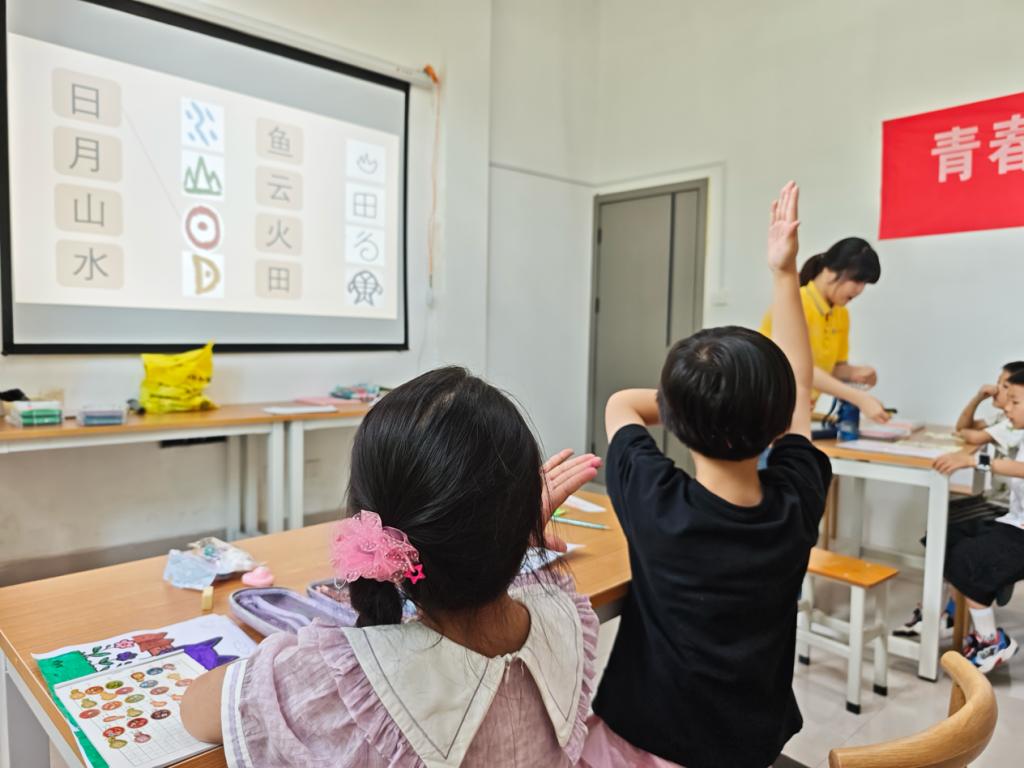 志愿者展示象形字演变过程,组织字形联想游戏,让孩子们变身“汉字侦探”,猜字形、对汉字、配英语。在趣味联想里触摸文化根脉,感受汉字智慧 。