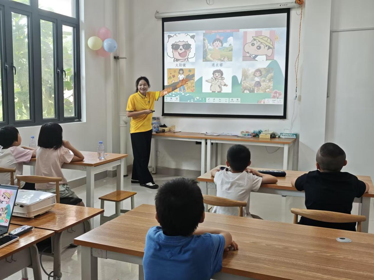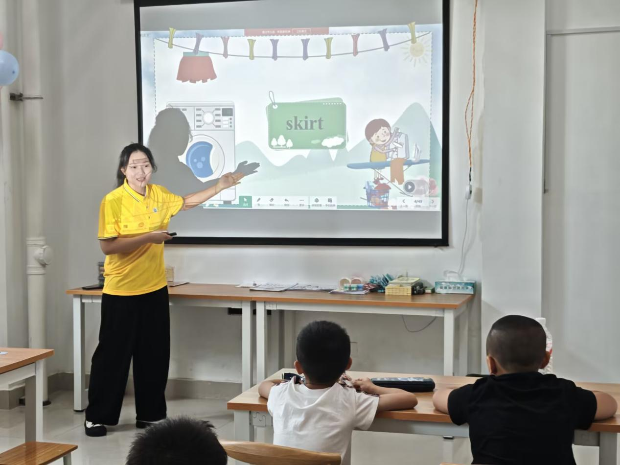 志愿者以课件为依托,清晰呈现“skirt(短裙)”等衣物词汇。通过 “单词跟读” 环节,用富有节奏的领读,带着孩子们反复打磨发音,夯实发音基础。紧接着“快速反应小游戏”瞬间点燃热情,志愿者高举衣物卡片,孩子们迅速抢答英文,课堂气氛浓烈。