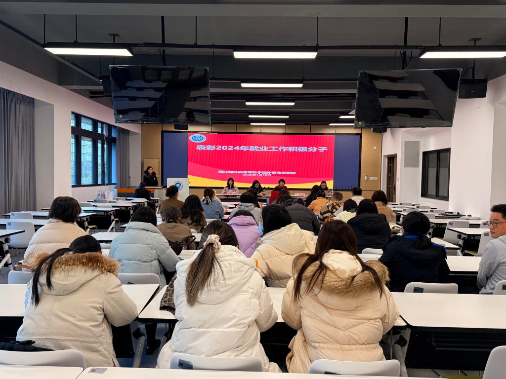 2025 年 1 月 10 日下午,外语商贸学院在产创楼 307 多功能报告厅召开学院全体教职工会议。学院党总支书记林锦芯、院长何少娴、副书记卢燕红、副院长陈海燕、副院长刘诗雨及全体教职工参会。会议由刘诗雨副院长主持。