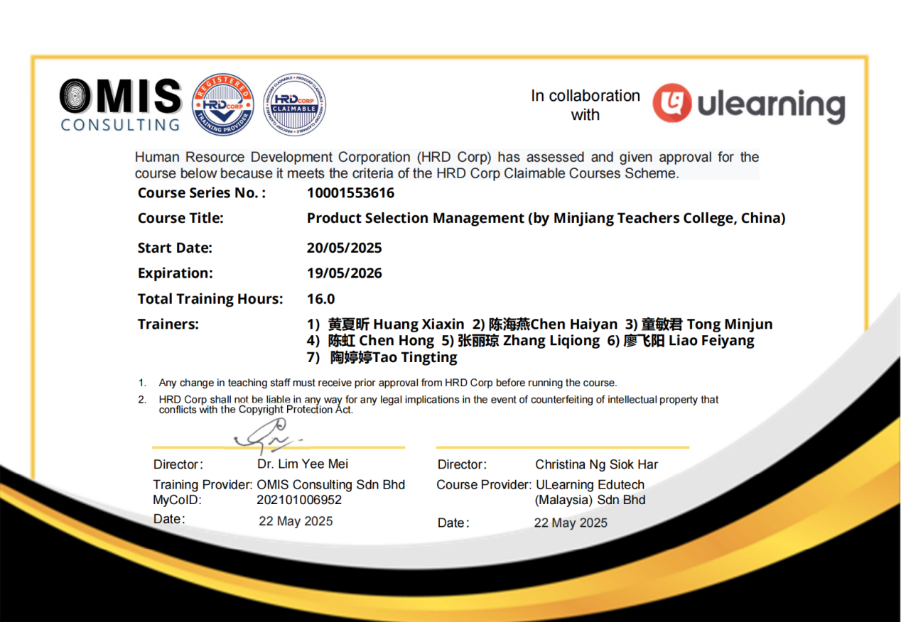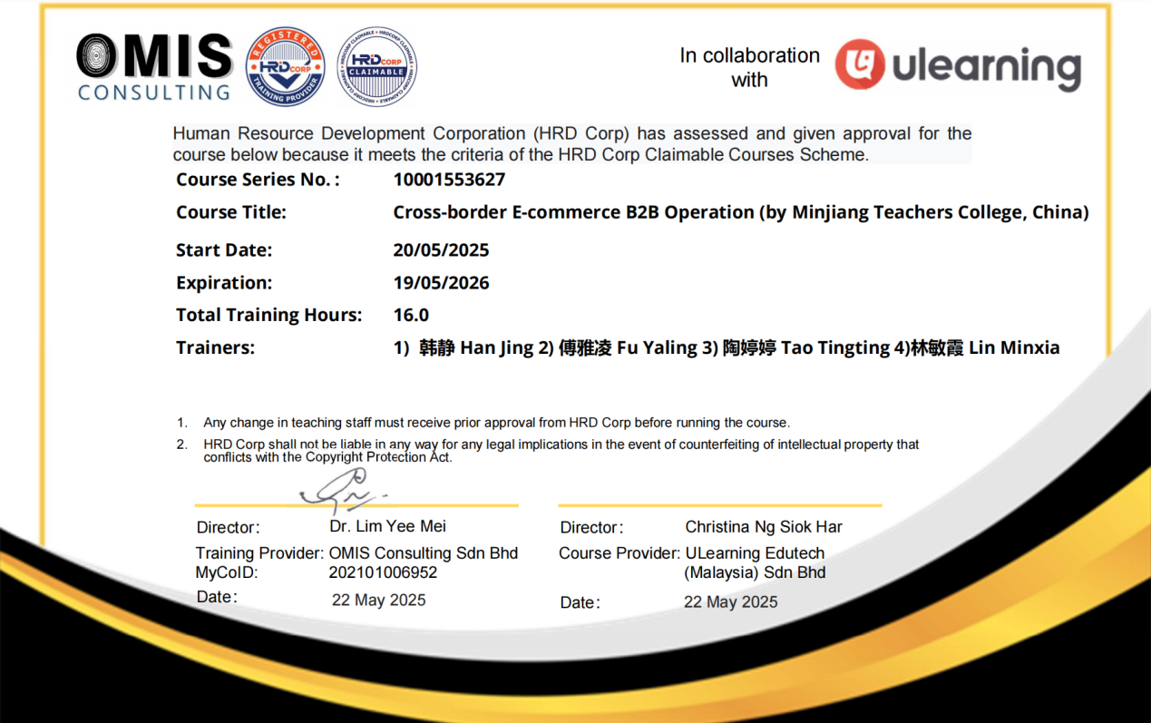 马来西亚人力资源发展局隶属马来西亚国家人力资源部,负责马来西亚劳动力的培训和发展,推动就业和工业培训安置、职业指导和咨询,为具有不同技能、背景和能力的马来西亚人开发创收机会。《跨境电商B2B运营》与《选品管理》作为培训课程,面向高校、企业员工和成人开放。参加短期课程的学员可以申请该局的补贴和获得当地相关行业雇主的认可,增加就业机率。