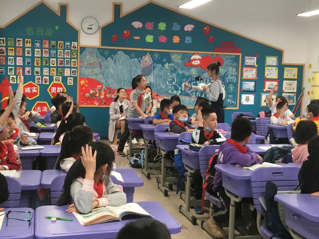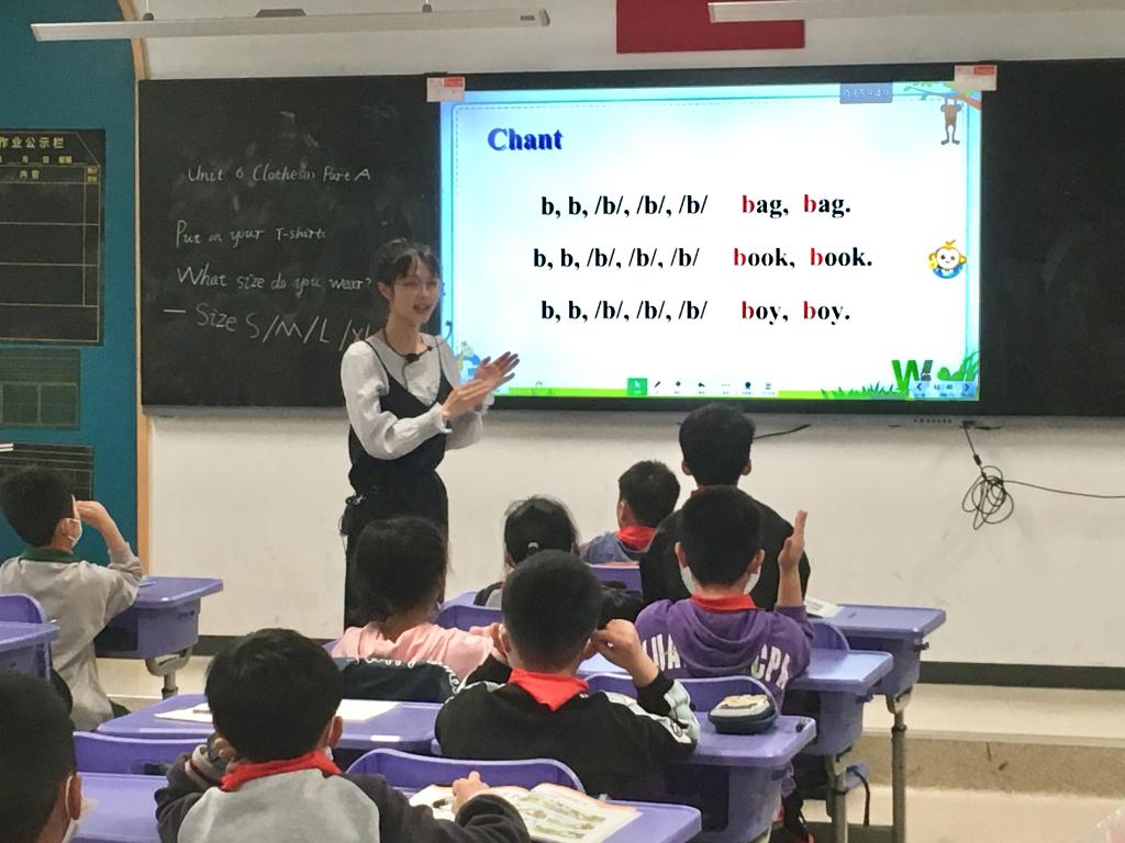 在上课前,老师播放歌曲Who is Wearing a T-shirt Today并与同学们进行了问候互动,同学们对新老师的到来感到十分激动,表示欢迎。在课堂中,学生们积极参与丰富的课堂活动,如单词连接游戏等。老师引导操练了put on, wear等单词以及句型“What size do you wear?”“It’s too big.”“It’s too small”等。不仅如此,师生还进行了多样的课堂互动:如ask and answer 与 do a reach。这些互动使学生充分掌握了本节课所学内容,最后老师也对积极参与课堂活动的同学,进行表扬和奖励。