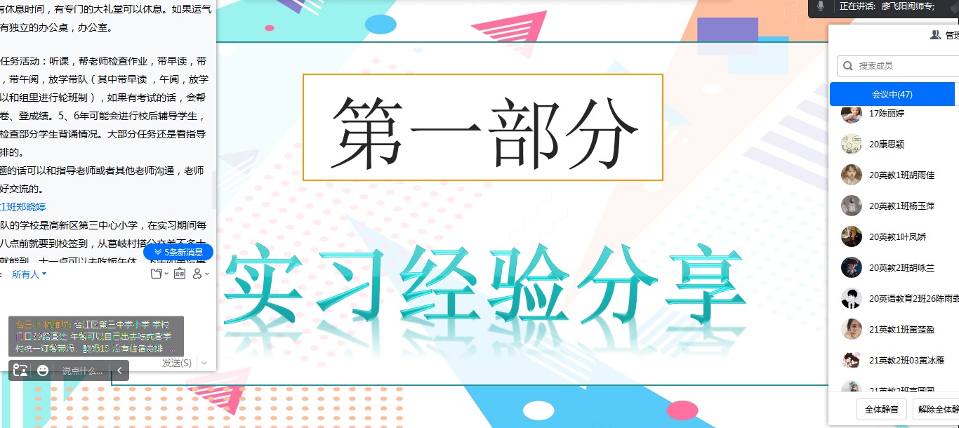 本次座谈会主要分为实习经验交流和互动答疑两个环节。首先,由20级各小学的实习队长就自己前往的实习地点及实习任务进行简要介绍,然后分享自己的实习体验。接下来是提问环节,21级学生代表向他们的学姐学长以及实习带队老师进行了事无巨细的提问。双方有问有答,座谈会气氛很是热烈。