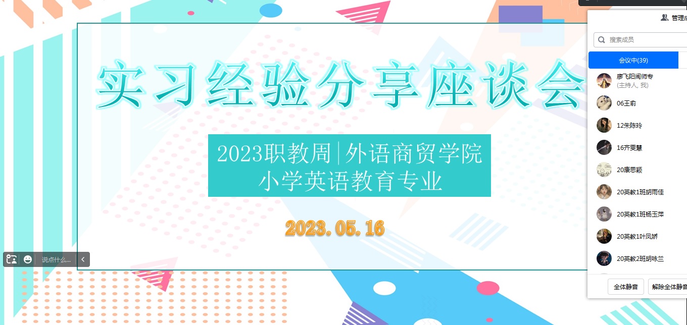 为了引导学生树立专业自豪感和职业认同感,增进21级小学英语教育学生对英语实习相关事宜的了解,外语商贸学院英语教育教研室于2023年5月16日晚开展实习经验分享云座谈会。20级各小学实习队的学生队长,21级小学英语教育的学生代表,以及安排实习活动的相关教师参加了本次活动。
