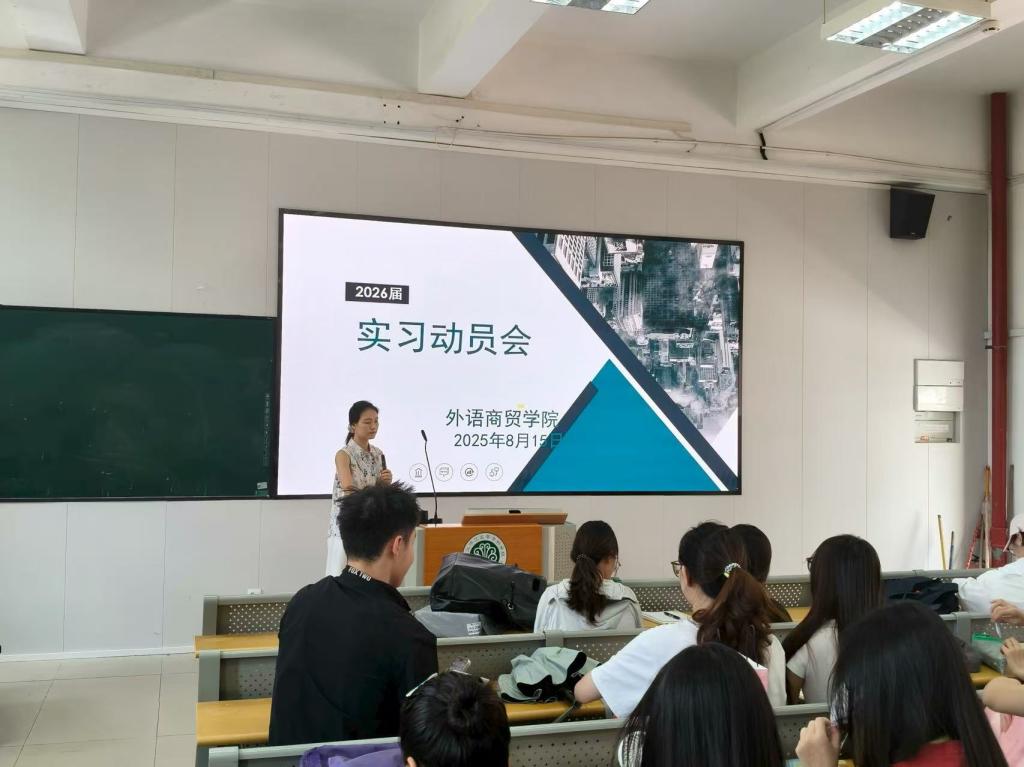 为保障学生实习工作有序、安全开展,8月15日12时,外语商贸学院应用外语专业在教学楼2014教室召开2026届毕业实习动员大会。应用外语教研室主任金曦、院团委书记占婷、实习指导老师詹秀萍及全体应用外语专业实习生参加本次动员会。