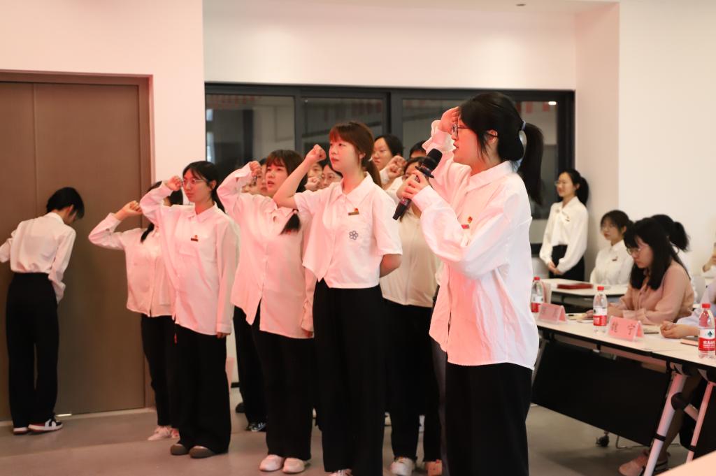 会议伊始,全员肃立,奏唱国歌。随后,主持人宣读校五四红旗团支部和校优秀共青团员名单,林冉书记、卢燕红副书记上台颁奖。紧接着,主持人公布明星志愿者、优秀志愿者、第二课堂学习标兵获得者名单,林珊湉老师、魏宁老师上台为其颁奖。而后,开始会议的第三项议程,新发展团员入团仪式。新团员整齐出列,全体老师为其佩戴团徽,团委学生会组织部部长吴思慧同学领新团员右手握拳,在团旗的见证下庄严宣誓,学院领导对新团员表示热烈的祝贺和殷切的希望。最后,全体起立,奏唱团歌,表彰大会圆满结束。