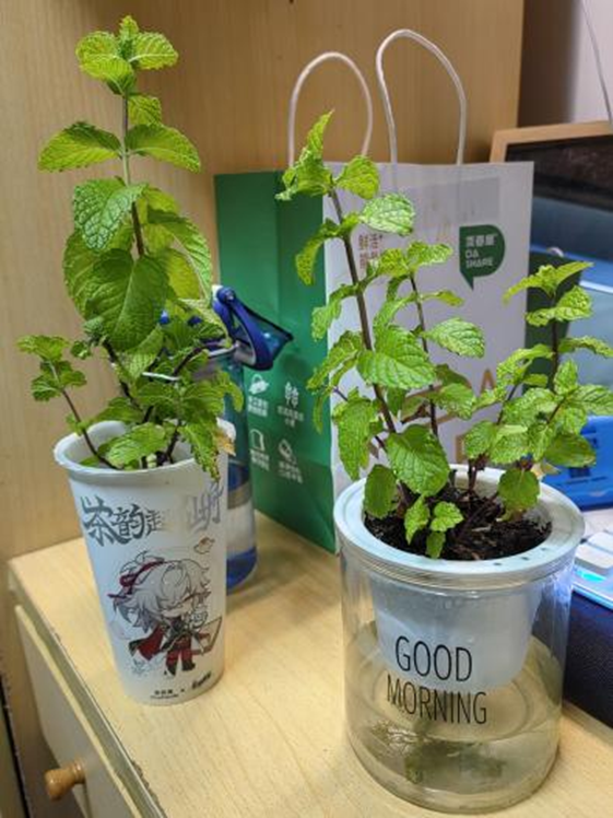 他们宿舍每周三都会进行全面清理,洗刷阳台、地面和洗衣台污垢,以保持宿舍整洁;他们在阳台水龙头处装了滤水器,进一步净化宿舍日常水质;他们还会购买香薰置于宿舍内,使得宿舍清新无异味;不仅如此,他们还利用空的奶茶瓶子栽种薄荷等小绿植改善生活品质。