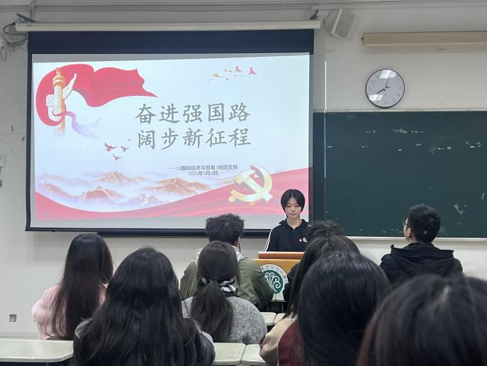 为引领青年学生弘扬爱国主义精神,增强民族自豪感和归属感,激发支部团员爱党爱国爱校热情,培养团员关注国家大事、关心社会发展的责任感,2025年3月,外语商贸学院24国际经济与贸易1班团支部开展“奋进强国路,阔步新征程”活力团支部系列活动。