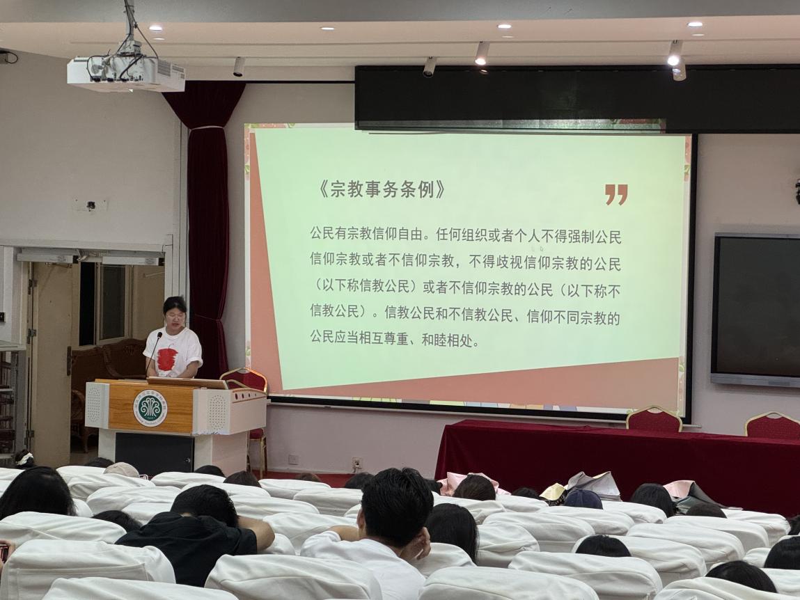 活动伊始,辅导员们围绕《中华人民共和国宪法》、《中华人民共和国爱国主义教育法》、《宗教事务条例》等法律法规展开讲解。首先,从宪法层面阐释公民宗教信仰自由的权利与边界,强调“自由以合法为前提”。随后,结合《爱国主义教育法》说明宗教团体及信众需增强国家意识、公民意识、法治意识与爱国情感,与社会主义社会相适应。最后,通过《宗教事务条例》的解读和真实案例的呈现,区分合法与非法宗教活动特征,警示非法活动危害及法律后果,叮嘱学生自觉遵守法律法规,坚决抵制非法宗教活动。