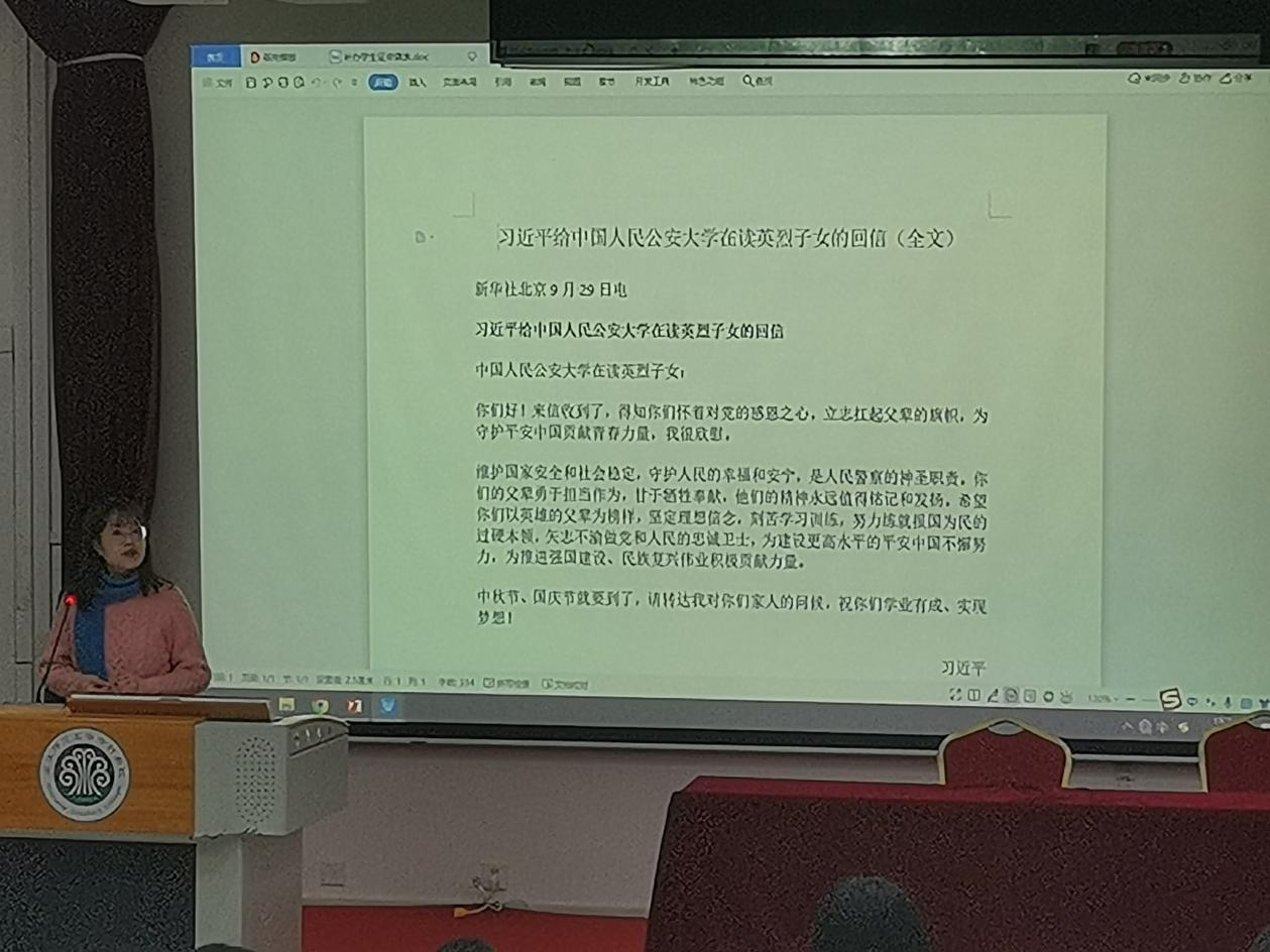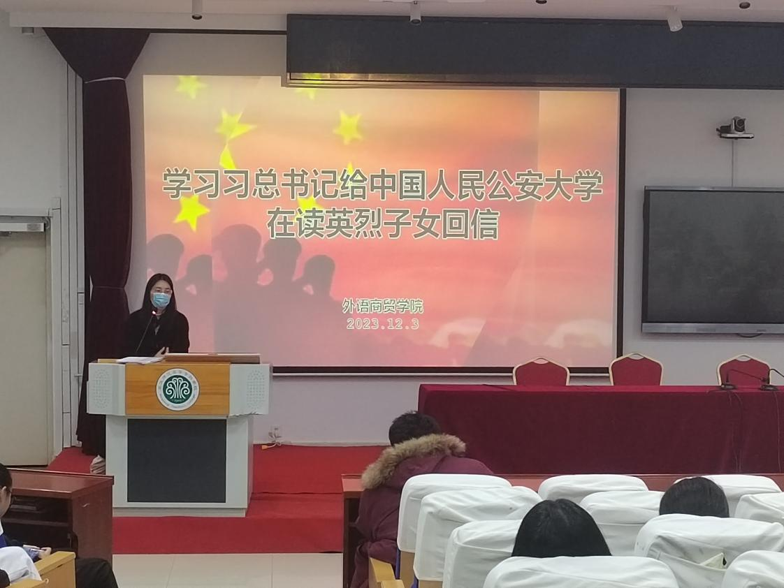为学习、宣传、贯彻《习近平总书记给中国人民公安大学在读英烈子女重要回信》精神,激励同学们为国家发展贡献自己的力量,外语商贸学院于2023年12月6日开展了“学习英烈精神,汲取奋进力量”的主题教育。我院全体学生参与。