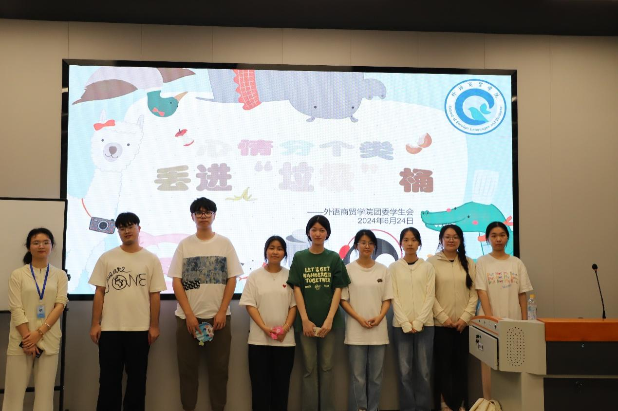 为了缓解学生期末考试心理压力,帮助同学们调整好最佳的考试状态,自信从容备考,同时宣传垃圾分类的绿色理念,外语商贸学院于2024年6月24日在旗山校区产创楼E-302教室举行了“心情分个类,丢进垃圾桶”活动。