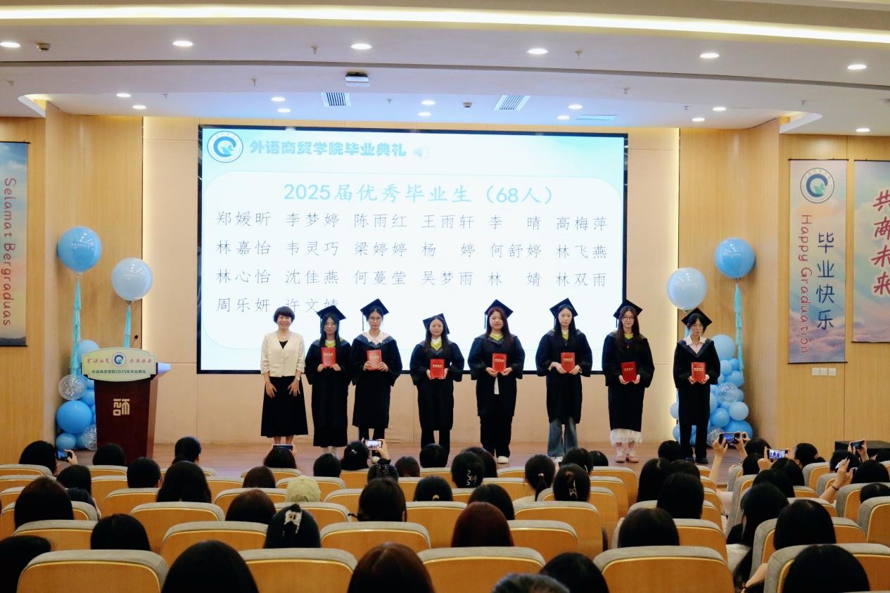 国歌奏响,全体起立。毕业典礼正式开始。首先,卢燕红副书记宣读2025届三好学生、优秀学生干部、优秀共青团员、优秀志愿者、优秀实习生获得者名单,并与刘诗雨副院长共同为获奖学生代表颁发荣誉证书。接着,陈海燕副院长宣布外语商贸学院2025届毕业生毕业决定;何少娴院长为毕业生代表颁发毕业证书。然后,林锦芯书记宣读外语商贸学院2025届优秀毕业生表彰名单,为他们颁发荣誉证书,祝愿他们带着这份荣誉赋予的勇气和信念,在人生新征程上继续书写属于自己的辉煌篇章。
