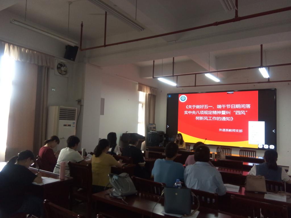 2021年5月20日下午,外语系教师支部在行政楼8楼党员活动会议室召开5月理论学习和“红色外语”之“建党100周年”系列微党课学习。本次理论学习和微党课活动均由支部书记何凌同志主持。