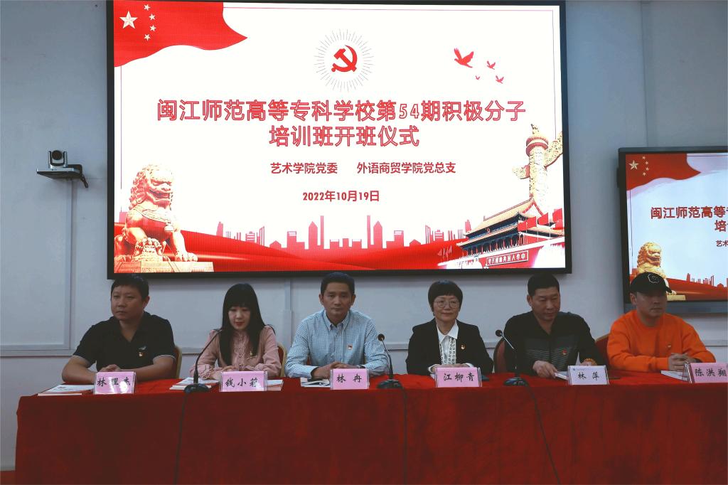为切实做好入党积极分子的培养教育工作,提高入党积极分子的思想政治素质,严把入党“第一关”,切实加强入党积极分子的培养教育,确保发展党员的质量。根据校党委要求和学院党总支部署安排,在党的二十大召开之际,我院于2022年10月19日在旗山校区2016教室与艺术学院党总支联合举办了“喜迎二十大,永远跟党走”——闽江师范高等专科学校第54期入党积极分子培训班开班仪式。外语商贸学院党总支书记林冉、艺术学院党委书记江柳青、副院长陈洪翔,外语商贸学院综合科科长刘诗雨、组织员詹秀萍、学生支部书记钱小莉以及艺术学院和外语商贸学院的87名入党积极分子参加了本次开班仪式,会议由艺术学院学生支部书记周宇航主持。