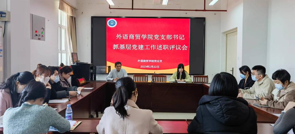 2月22日下午,外语商贸学院党总支在旗山党员活动室举行2022年度党支部书记抓基层党建工作述职评议会议。学院党总支书记、总支委员、支部委员,以及学生和教师党员代表参加了评议会。