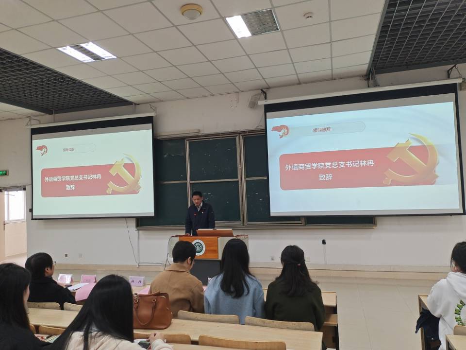 根据学校党委要求和学院党总支部署安排,为了更好的贯彻落实《中国共产党章程》,进一步推进入党积极分子培训工作方针的实施,落实好党员发展培训工作,帮助入党积极分子进一步掌握党的知识,提高素质,切实保证新发展党员的质量,我院党总支于2023年3月29日在旗山校区3018教室与艺术学院党委联合举办了闽江师范高等专科学校第59期入党积极分子培训班开班仪式。外语商贸学院党总支书记林冉、艺术学院党委书记江柳青、外语商贸学院教师支部书记陈颖、外语商贸学院组织员詹秀萍、艺术学院组织员林惠楠、艺术学院学生支部组织委员沈景城以及两个学院的82名入党积极分子参加了本次开班仪式,仪式由外语商贸学院党总支纪检委员、教师支部副书记何凌主持。