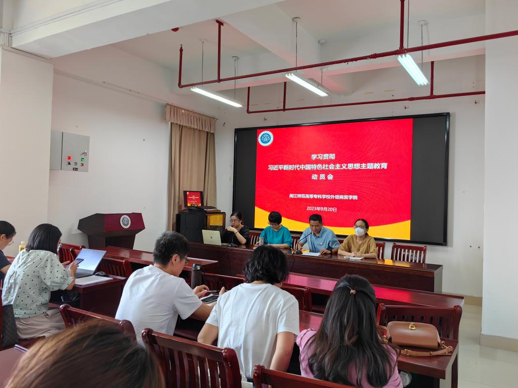 2023年9月20日下午,外语商贸学院党总支于旗山校区综合楼8楼党员活动室,召开学习贯彻习近平新时代中国特色社会主义思想主题教育动员会,认真贯彻中央、省委、市委和校党委关于深入开展主题教育的部署要求,对学院开展主题教育进行动员部署。会议由外语商贸学院院长何少娴主持,外语商贸学院党总支书记林冉作主题教育讲话,外语商贸学院全体教职工参加会议。