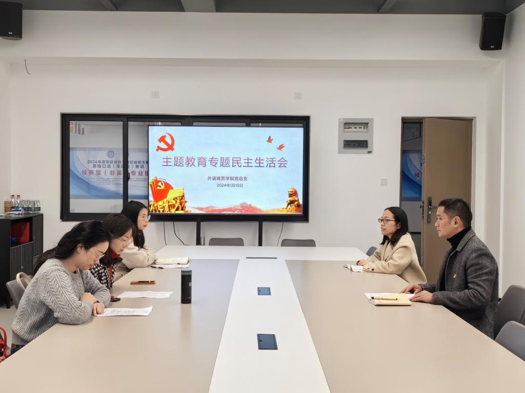 2024年1月10日下午14:30,外语商贸学院党总支在产创楼303开展学习贯彻习近平新时代中国特色社会主义思想主题教育专题民主生活会。