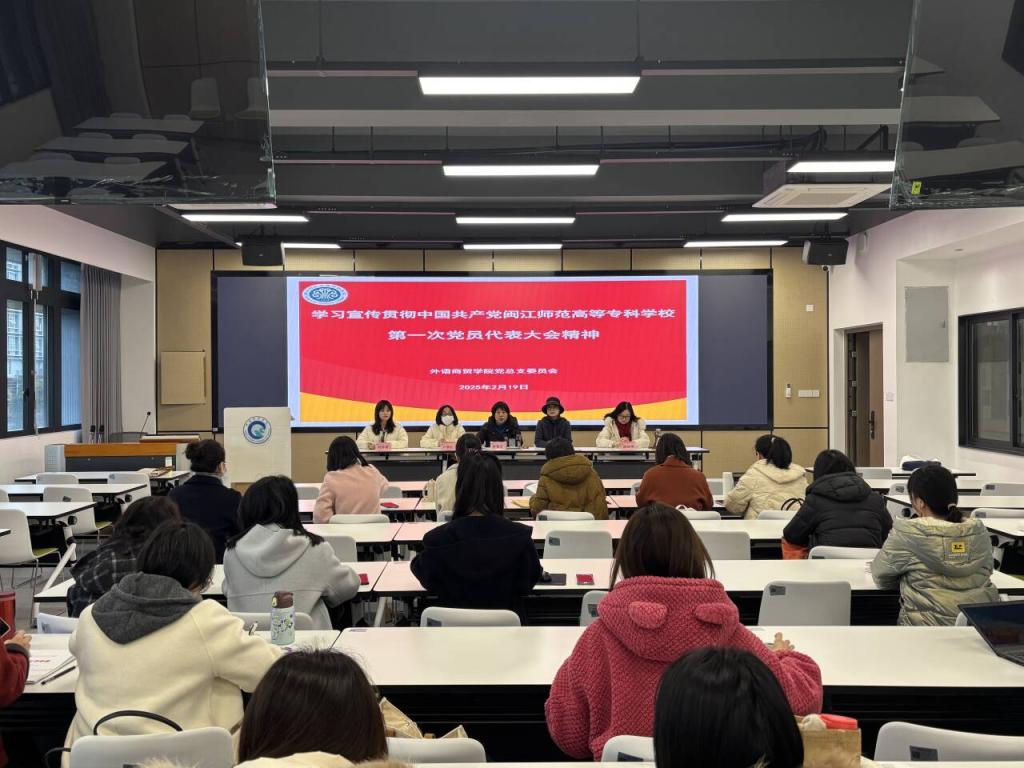 2025年2月19日下午,外语商贸学院党总支学习宣传贯彻中国共产党闽江师范高等专科学校委员会第一次党员代表大会精神,学院全体党员和群众代表参加本次学习,会议由党总支书记林锦芯主持。
