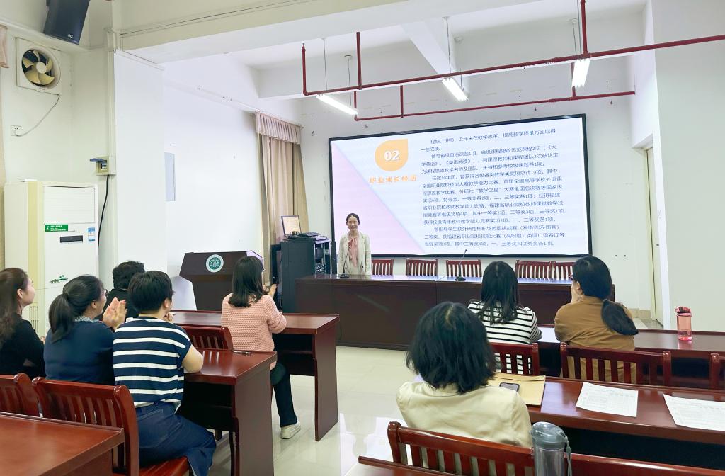 活动上,优秀青年教师程妍首先对自己做了简单介绍,回顾了自己的职业成长经历。自入职10年以来,她扎根教学教研工作,在教学改革、提高教学质量方面取得不错的成绩。曾参与省级重点课题1项,省级课程思政示范课程2项(《大学英语》、《英语阅读》),与课程教师和课程团队被认定为课程思政教学名师及团队,主持和参与校级课题各1项。曾获得各级各类教学类奖项总计19项,其中国家级和省部级各6项;曾指导学生获省级奖项7项。