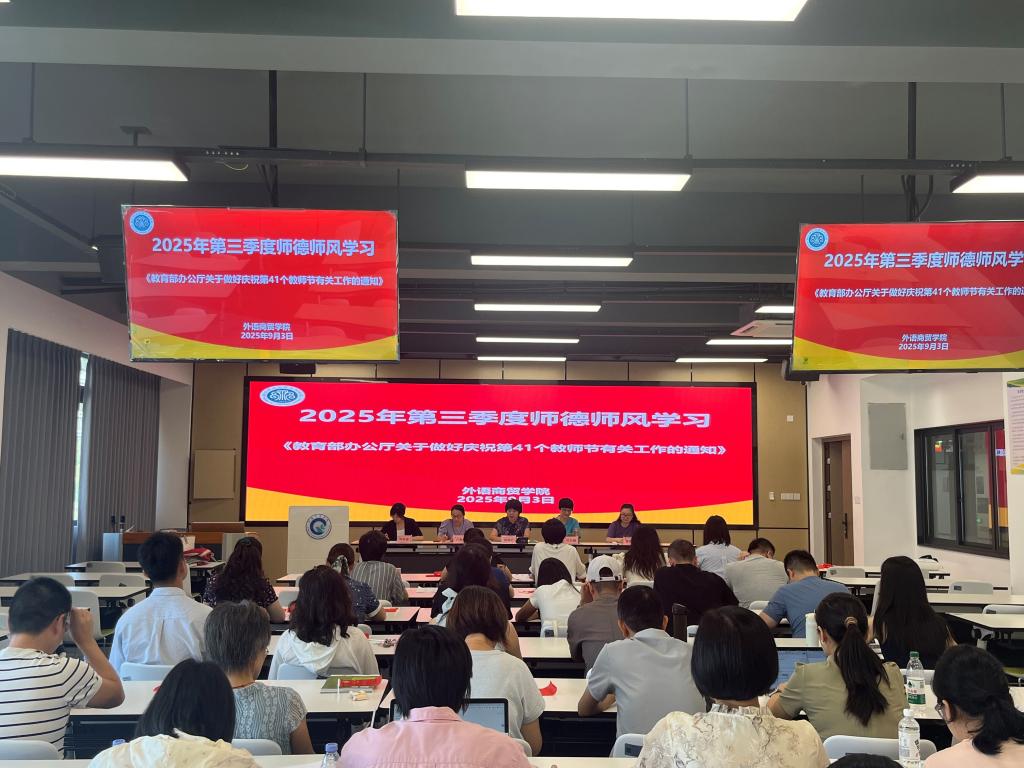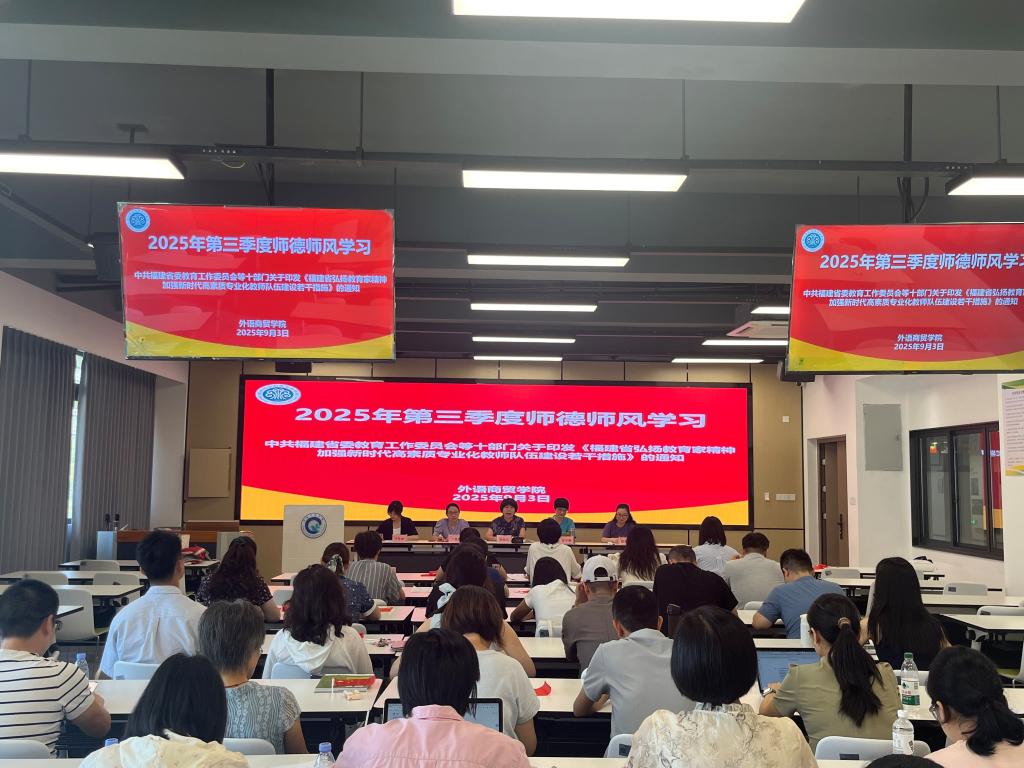 9月3日上午,外语商贸学院于产创楼307室多功能报告厅召开师德师风第三季度专题学习会,学院党总支书记林锦芯、院长何少娴、副书记卢燕红、副院长陈海燕、副院长刘诗雨及全院教职工参会。