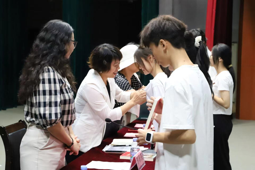 接着,学院领导为8位新生代表佩戴校徽,并赠上《习近平与大学生朋友们》一书。这一环节充满了仪式感,标志着新生们正式成为学校的一员,肩负起新的使命和责任,希望新生们能将闽江师专“养浩然气、广仁爱心”的校训内化于心,外化于行。