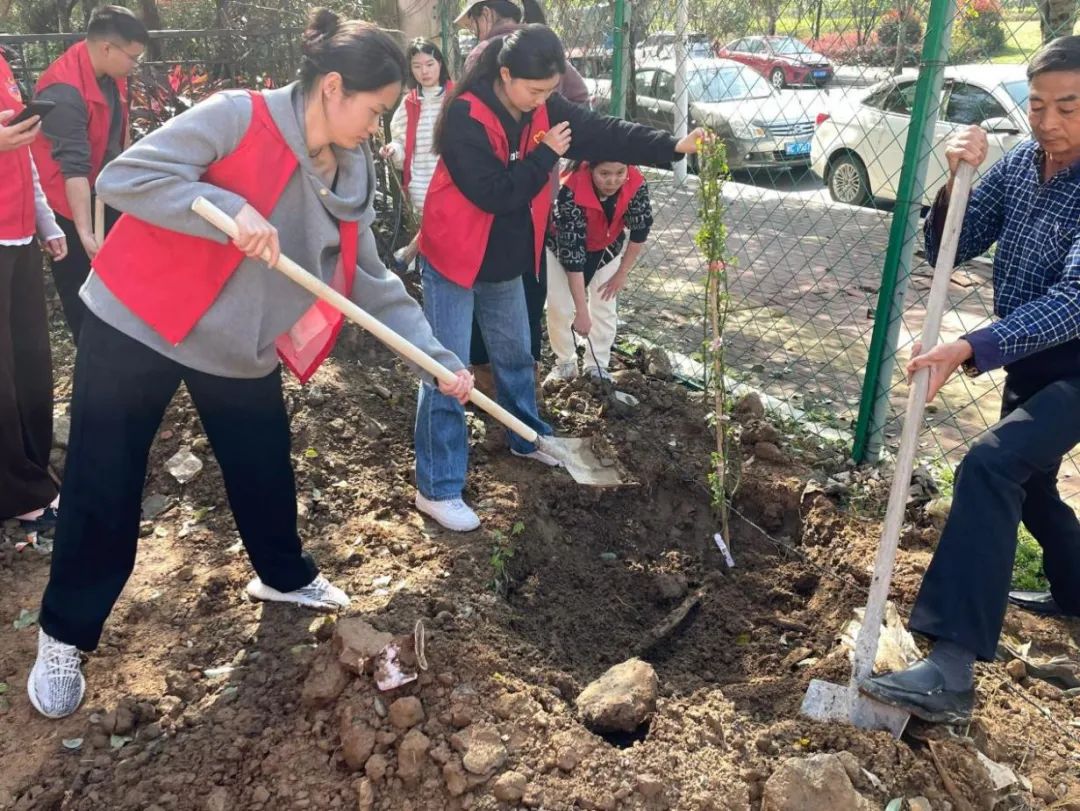 活动中,大家分工合作,有的负责搬运树苗,有的负责挖坑培土,还有的负责浇水施肥。经过大家的共同努力,新栽植的树苗错落有致、迎风挺立,在和煦的春风里洋溢着勃勃生机。同学们还在社区工作人员的指导下,将提前准备好的花籽种出“五角星”和“同心圆”的形状,为社区增添一处处美丽的风景。