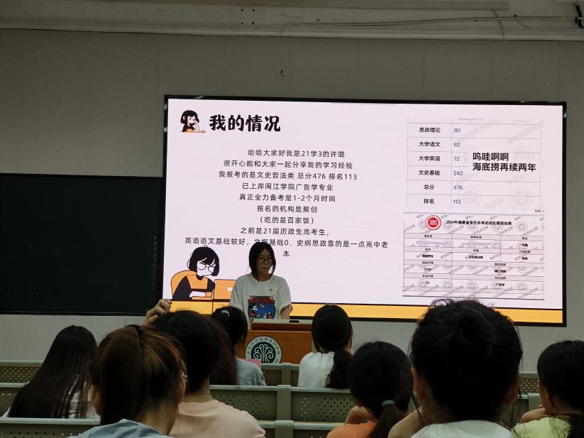 陆子琳和许璐两位同学则侧重分享文史经管类考试的高效复习之道,包括制定详细的学习计划,合理分配时间,绘制思维导图,善于总结归纳等,除此之外,她们还表示保持积极向上的心态也是专升本成功上岸的重要因素之一。最后,她们鼓励在场的同学们,坚定信念,积极备考,争取优异成绩。