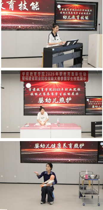 紧接着,进入技能展示环节。2025年福建省职业院校技能竞赛的参赛学生们展示了幼儿教育技能、婴幼儿照护技能以及婴幼儿健康养育照护技能。选手们凭借扎实的专业知识和熟练的操作技能,赢得了在场师生的阵阵掌声,彰显了学前教育学院的教学实绩。