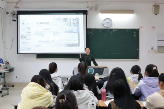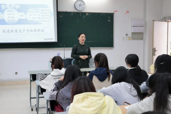课程伊始,林毓君院长向学生讲解了新质生产力的含义。她指出,新生产力具有高科技,高效能,高质量的特征,特点是创新,关键在质优,本质是先进生产力。课堂上,林毓君院长以通俗易懂且生动形象的方式,向同学们阐释了新质生产力的深刻内涵与重要意义。从前沿科技的创新应用到产业模式的变革转型,林毓君院长结合实际案例,详细剖析了新质生产力在当下经济社会发展中的多样表现形式。
