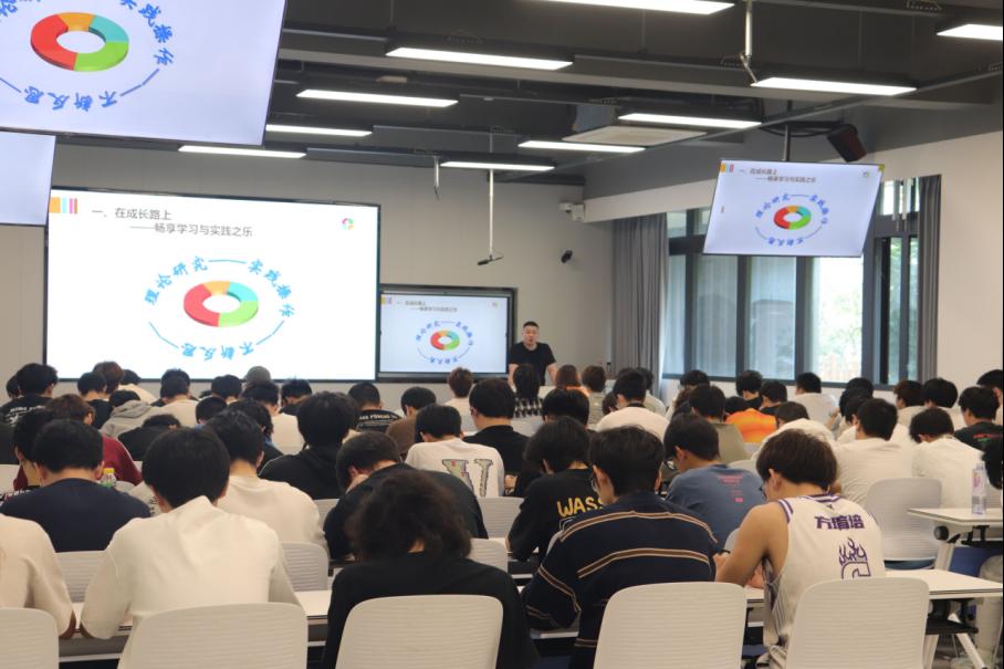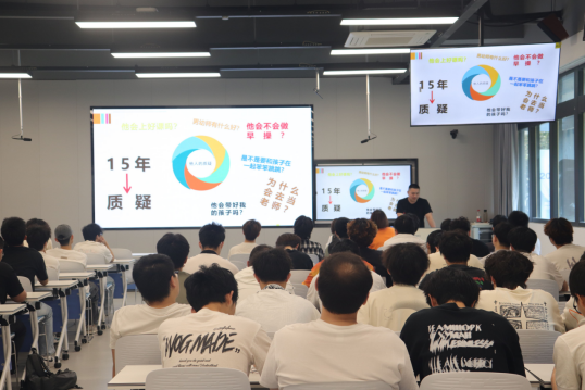 讲座现场,林峰老师以"破局·成长·赋能"为主线,结合自身15年幼教工作经历,为在座的男生们剖析了男性教师在职业环境中可能面临的独特压力与挑战,并强调了男教师在幼儿教育中的独特价值和角色担当。针对男幼师在职业发展过程中可能遇到的问题,林峰老师提出了一系列具体而实用的建议。他鼓励同学们要学会管理情绪,保持平和的心态;要善于向孩子学习,从孩子们身上汲取生活的乐趣和正能量;要对新事物保持好奇心,不断学习和进步;要尊重规则,树立良好的职业形象;同时,还要具备良好的环境适应能力,能够在不同的教育环境中游刃有余。在未来的幼教事业中发挥男性教师的独特优势。