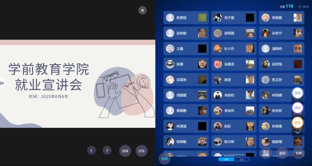为切实推动2025届学前教育专业毕业生就业工作,加强校企合作实效,学前教育学院于6月8日成功举办“青春逐梦 ‘职’引未来”六月就业宣讲会。本次宣讲会结合厦门市海湾实验幼儿园和福鼎市双岳幼儿园两家优质单位的用人需求开展宣讲。2025届全体毕业生及辅导员王玮老师共同参与,会议由王玮老师主持。