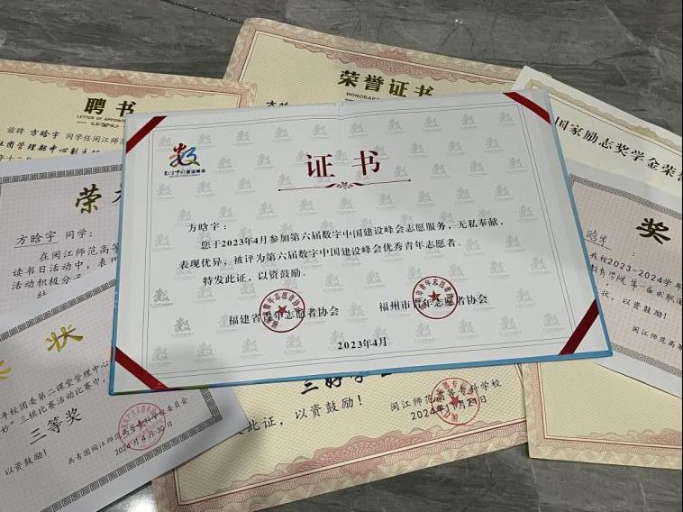 在工作方面,作为班长,他主动发起“互助学习小组”,有效提升班级凝聚力与学习氛围,带领班级荣获市级“五四红旗团支部”、校级“文明班级”等多项集体荣誉。同时,担任青年志愿者协会会长期间,他积极投身志愿服务,连续两年担任数字峰会志愿者,个人累计服务时长超520小时,连续两年获评校级“明星志愿者”,并荣获“福建省优秀志愿者”称号。